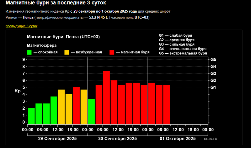 Магнитная буря, начавшаяся в ночь с 29 на 30 сентября, все еще не утихла. Она длится уже около 30 часов.