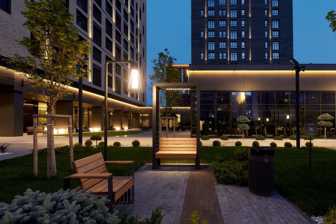 Световое оформление двора в премиальном проекте «Рисан» создает атмосферу сдержанной современной роскоши и деликатно подчеркивает ландшафт и наполнение двора, многие элементы которого были созданы по эскизам специально для этого проекта.