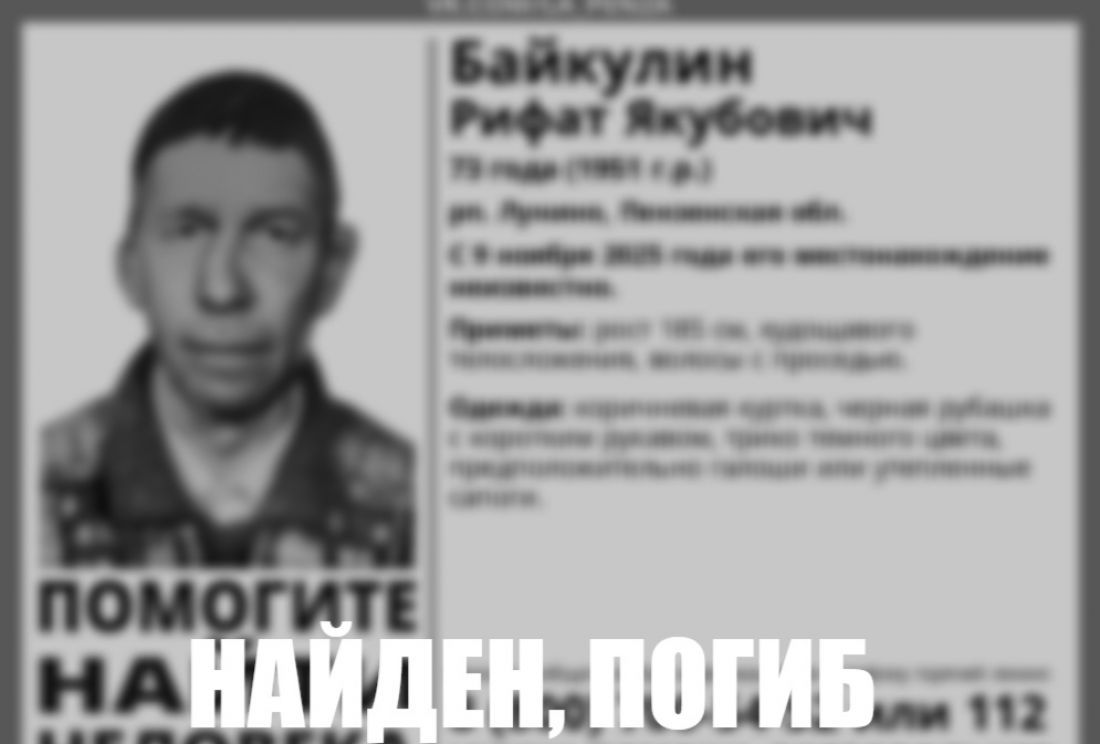 При каких обстоятельствах и где найдено тело мужчины, не сообщается. Местонахождение жителя р.п. Лунино было неизвестно с 9 ноября. Рифата Байкулина искали близкие, полиция и добровольцы.
