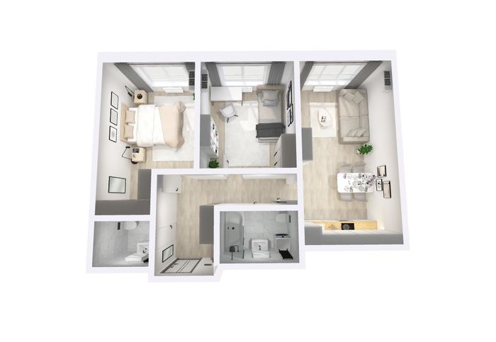 В другой евротрехкомнатной квартире площадью 64,2 кв. метра, например, предусмотрены две спальни одинаковой площади и два санузла, а в прихожей предусмотрено место для удобного размещения шкафа.