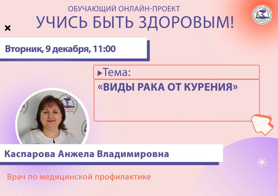 9 декабря в прямом эфире онлайн-проекта «Учись быть здоровым!» врач по медицинской профилактике Анжела Каспарова расскажет о видах рака от курения. Трансляция начнется в 11:00 в соцсети «ВКонтакте».