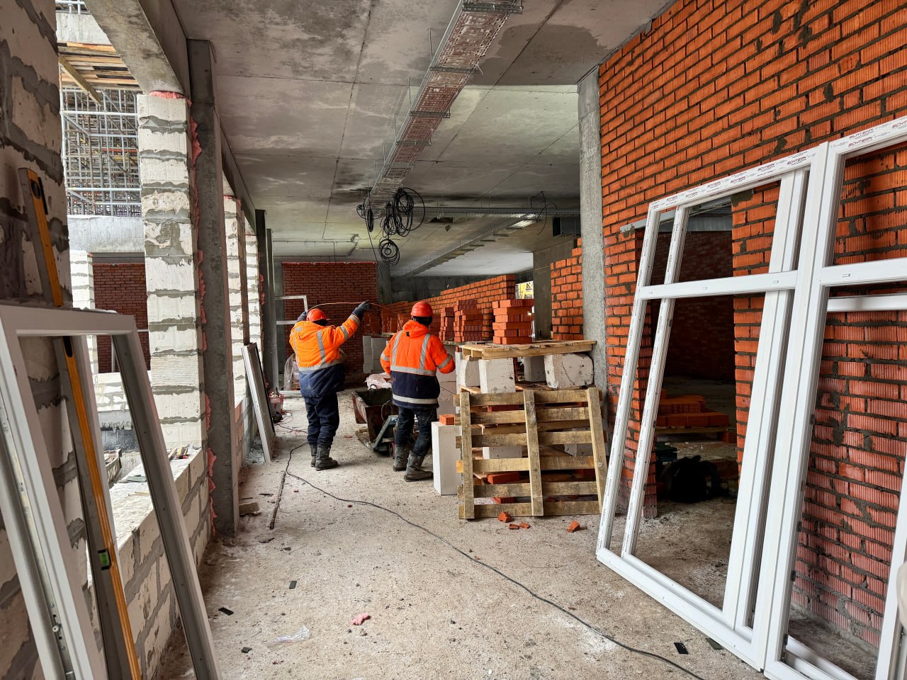В настоящее время на стройобъекте ведутся монолитные, штукатурные и электромонтажные работы, устройство наружных стен, перегородок, стяжки пола, а также установка оконных конструкций. В подвальном помещении проводятся работы по утеплению.