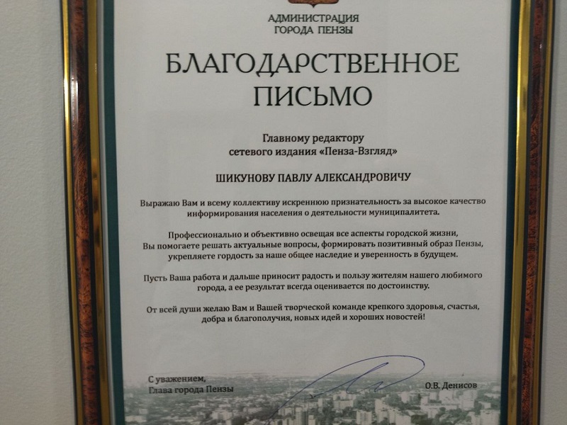 Помимо этого, глава Пензы Олег Денисов вручил благодарственное письмо редактору издания Павлу Шикунову.