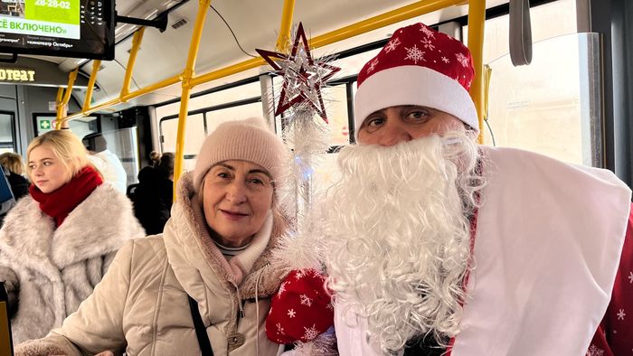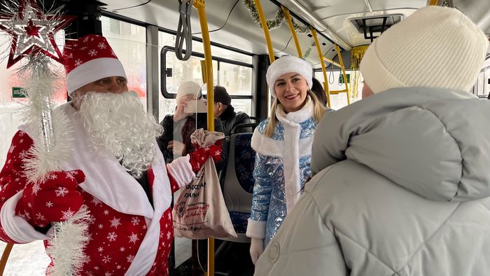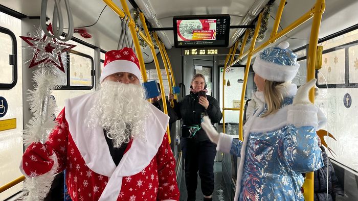 Чтобы создать праздничную атмосферу и поднять настроение пассажирам, троллейбусы в эти дни украшены новогодней символикой. В пятницу утром в салонах также звучали известные зимние композиции, а пассажиры вместе с Дедом Морозом и Снегурочкой отгадывали загадки.