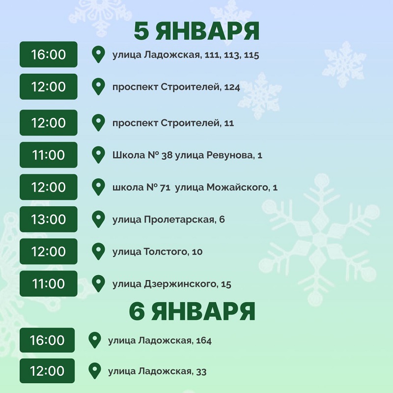 5 января новогодние елки пройдут по улице Ладожской, 111, 113, 115; на проспекте Строителей, 11, 124; в школах №38 и №71, на улице Пролетарской, 6; улице Толстого, 10; улице Дзержинского, 15.