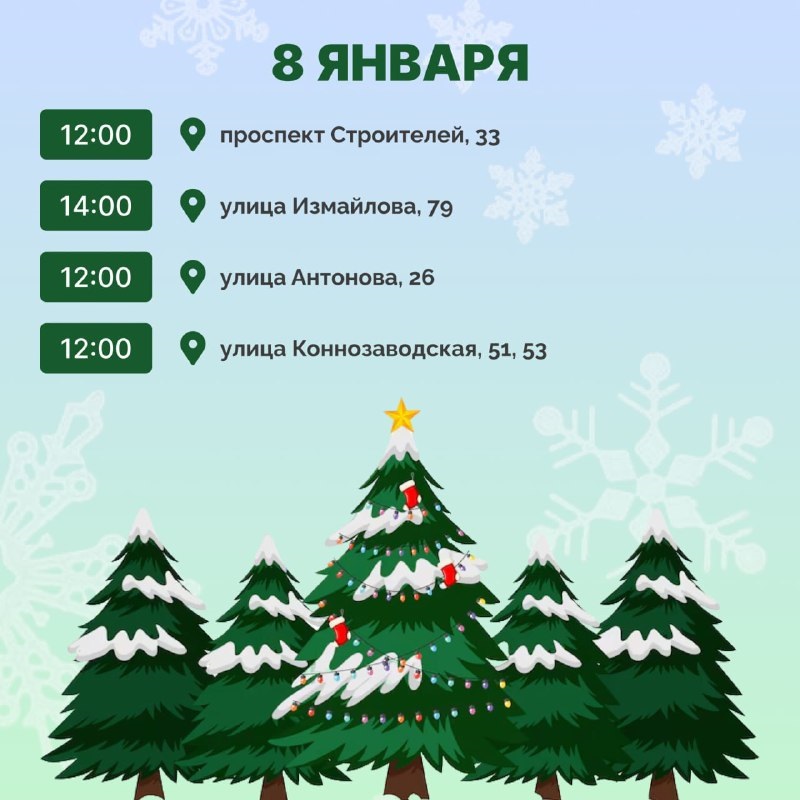 8 января праздничная программа охватит проспект Строителей, 33; улицу Измайлова, 79; улицу Антонова, 26; улицу Коннозаводскую, 51, 53.