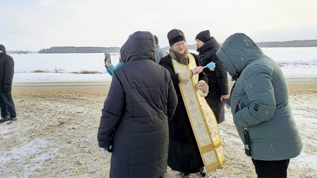 Крест освятил настоятель Никольского храма села Овчарное иеромонах Антоний (Умнов). После чинопоследования отец Антоний поздравил местных жителей с этим событием.