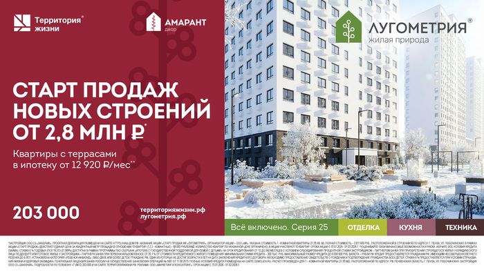 *Название акции "Старт продаж ЖК "Лугометрия", организатор акции – ООО «МК». Указана стоимость 1-комнатной квартиры площадью 31,95 кв. м., расположенной в строении №60 по адресу: г. Пенза, ул. Побочинская, полная стоимость – 2 811 600 руб.. В рамках акции "Старт продаж" действует единая цена за квадратный метр площади в отношении 10 квартир (1,2,3 - комнатные) - 88 000 рублей за кв.м. Количество квартир по указанной цене ограничено: в акции участвуют 10 квартир. Застройщик ООО СЗ «ЗАКАЗЧИК». Проектная декларация размещена на сайте https://наш.дом.рф. Сроки акции с 15.01.2026 - 01.03.2026г. Подробности на сейте территорияжизни.рф.