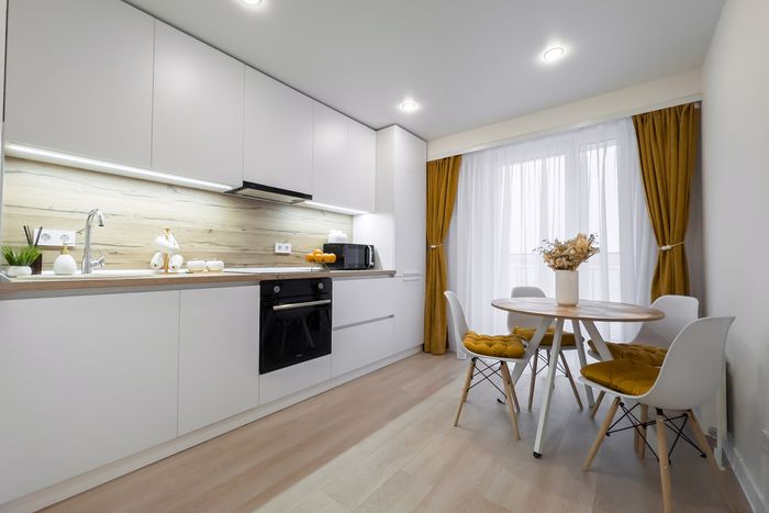- кухонный гарнитур, со встроенной бытовой техникой брендового производителя – духовой шкаф, вытяжка, варочная панель. В квартирах большой площади – посудомоечная машина.