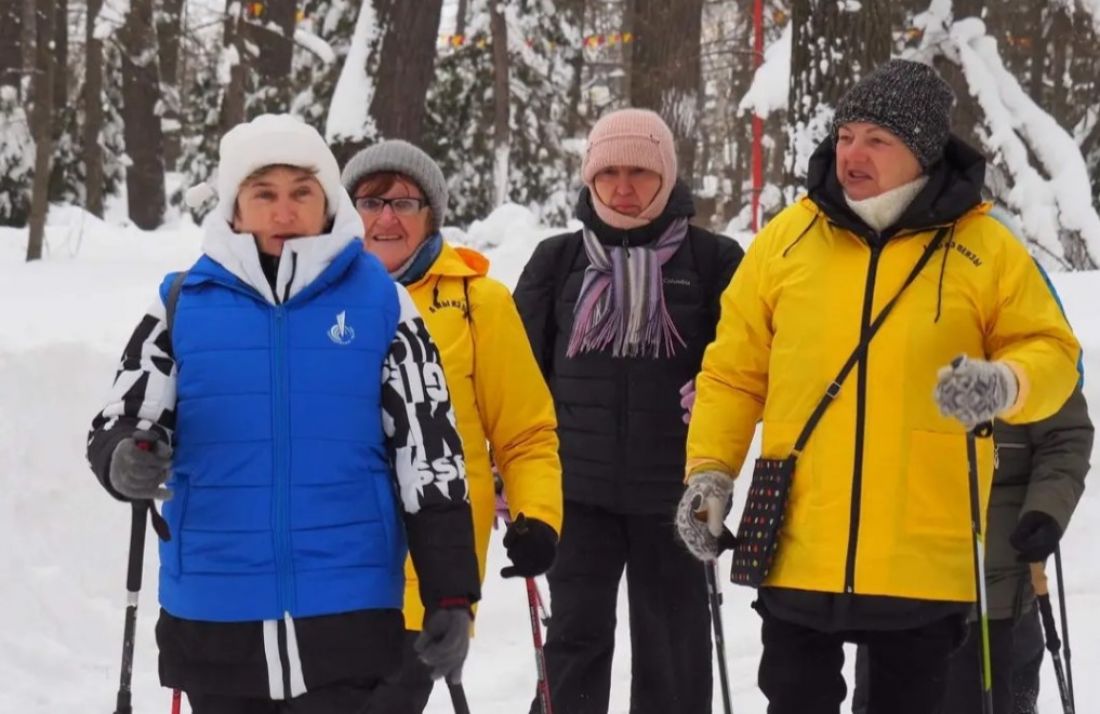 Около 70 активных жителей вышли на тренировку и продемонстрировали навыки скандинавской ходьбы и гимнастики.