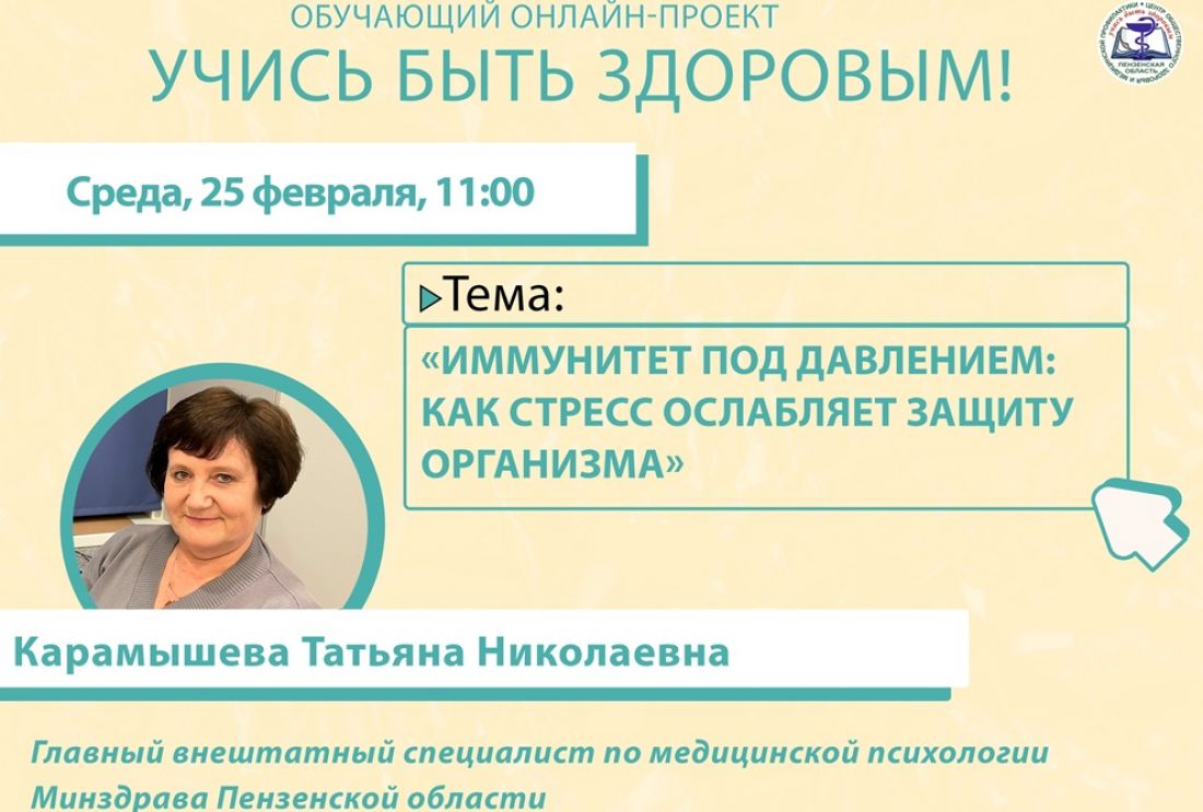 В группе Пензенского областного центра общественного здоровья и медицинской профилактики в социальной сети главный внештатный специалист по медицинской психологии Минздрава Пензенской области Татьяна Карамышева проведет эфир на тему «Иммунитет под давлением: как стресс ослабляет защиту организма».