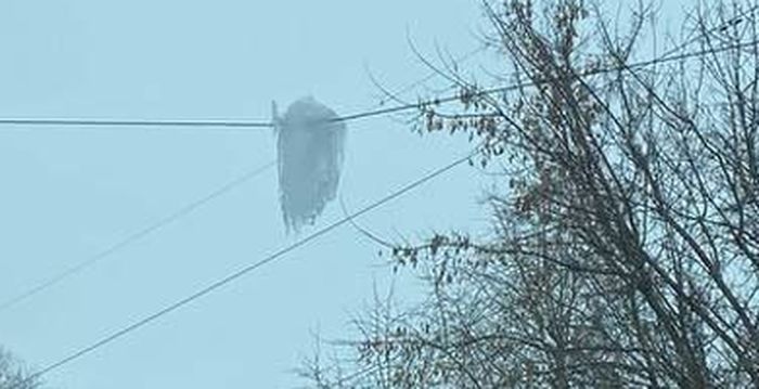 Льдина опасно висит на проводе, который натянут между опорами, и рискует в любой момент сорваться вниз - в лучшем случае на пустую дорогу, в худшем — на автомобиль или пешехода.