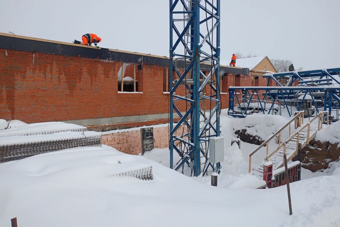 Строители возводят стены лечебно-диагностического корпуса больницы в Земетчино