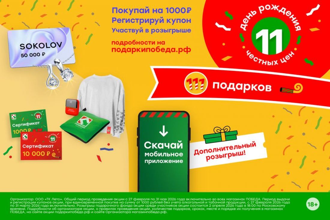 Соверши покупку на сумму от 1000 рублей в любом магазине ПОБЕДА до 31 марта 2026 года*. Получи на кассе купон с гарантированными подарками! Регистрируй код с купона на сайте подаркипобеда.рф и участвуй в розыгрыше 111-ти ценных призов: