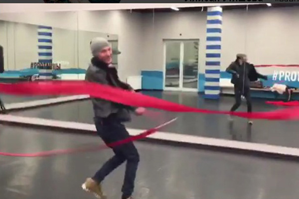 Павел Воля под руководством жены разучивает упражнение с лентой