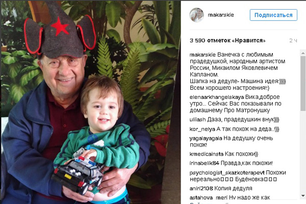 На снимке, который супруги Макарские опубликовали в соцсети, Михаил Каплан держит на коленях правнука Ваню, младшего ребенка Антона и Виктории. Поклонники звездной семьи сошлись во мнении, что малыш - копия знаменитого прадедушки.