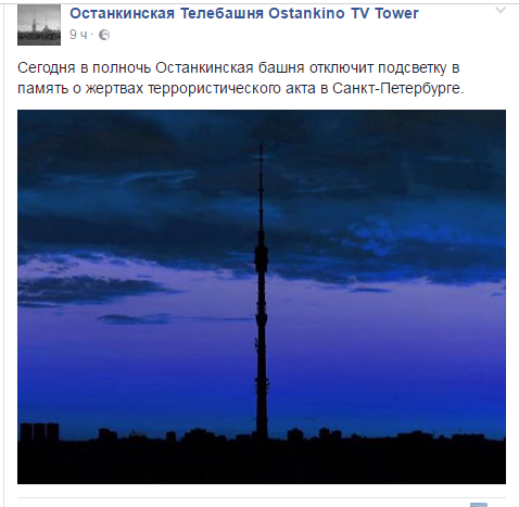 Согласно сообщению Российской телевизионной и радиовещательной сети в Facebook, в память о жертвах теракта в петербургском метрополитене ровно в полночь по московскому времени Останкинская башня погасила огни.