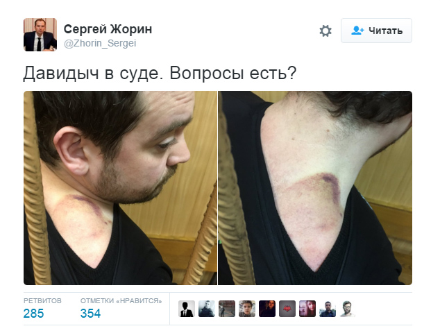 После вынесения приговора адвокат осужденного Сергей Жорин заявил, что Эрик Давидыч якобы подвергся избиению в отделении полиции, и приложил соответствующие фотоснимки.