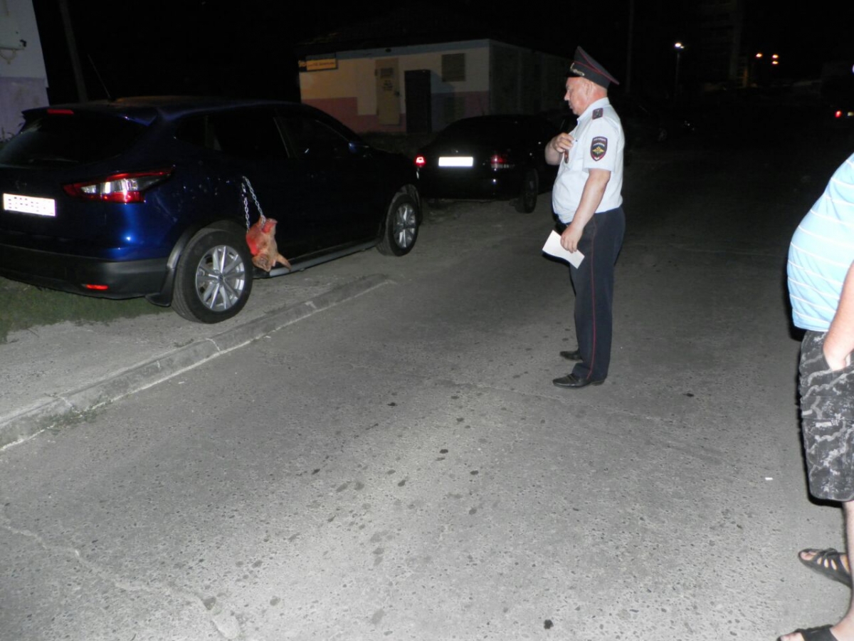 Как сообщает портал «Чебоксары 24», шокирующий случай произошел в чебоксарском микрорайне «Садовый» в ночь с четверга на пятницу. Оставленный на тротуаре «Nissan» получил в качестве украшения подвешенную на цепочке свиную голову.