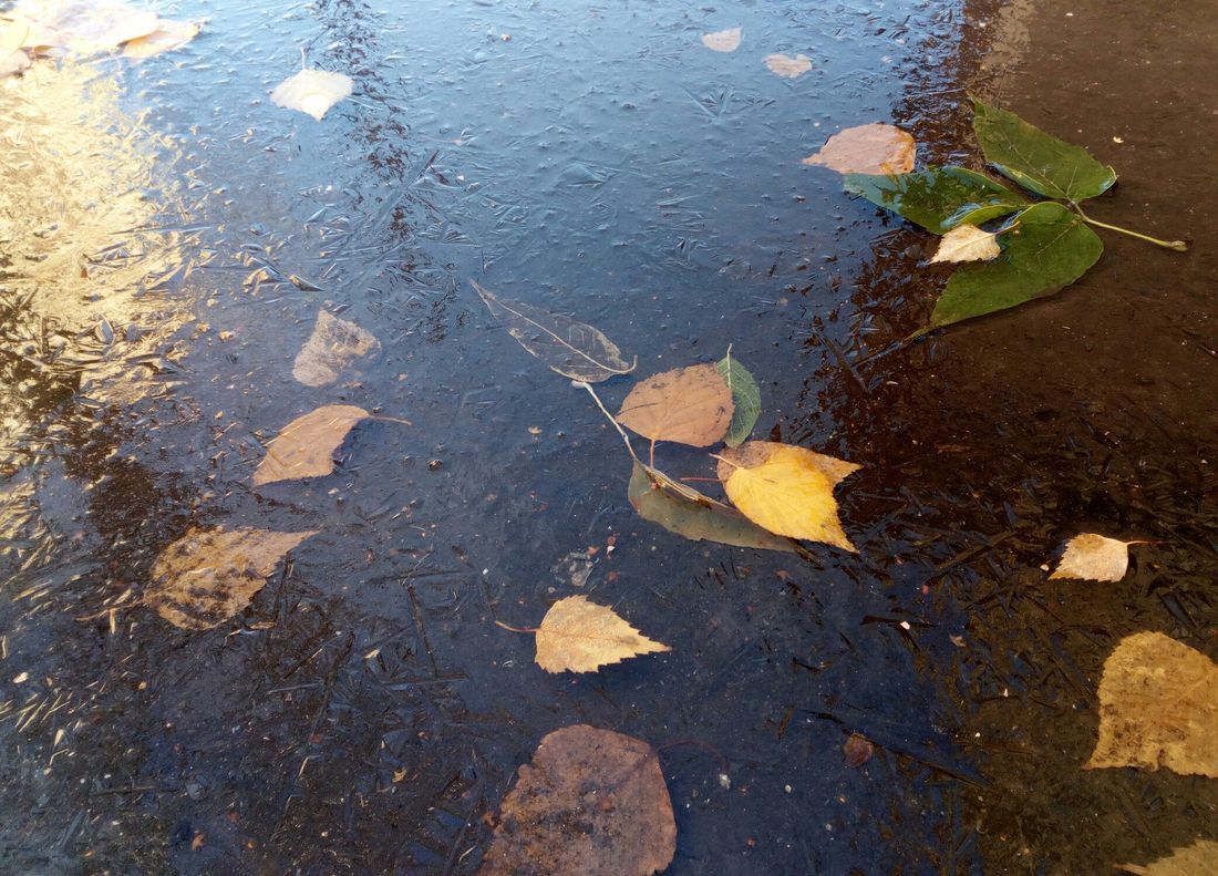 Ну а пока этого не произошло, невольно замедляешь шаг, чтобы бросить взгляд на застывшие в неподвижности разноцветные листья и отблески солнца в причудливом переплетении ледяных прожилок.