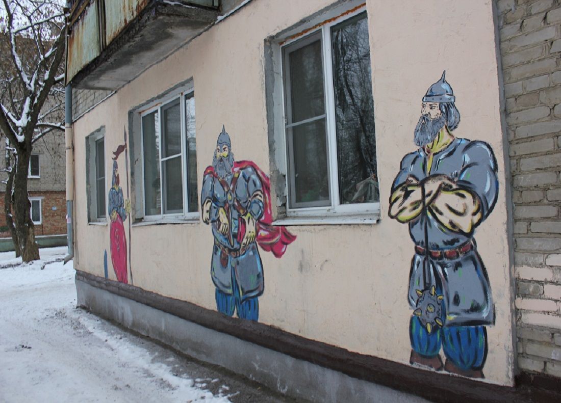 Трех былинных богатырей неизвестный автор разместил поверх утепления угла одного из домов на улице Ленинградской. Жаль, оштукатуренной поверхности хватило только на Илью Муромца, Добрыню Никитича и Алешу Поповича. Было бы больше места – пензенский Бэнкси мог бы изобразить и тридцать три богатыря под предводительством Черномора, по периметру дома - хоть 300 спартанцев.