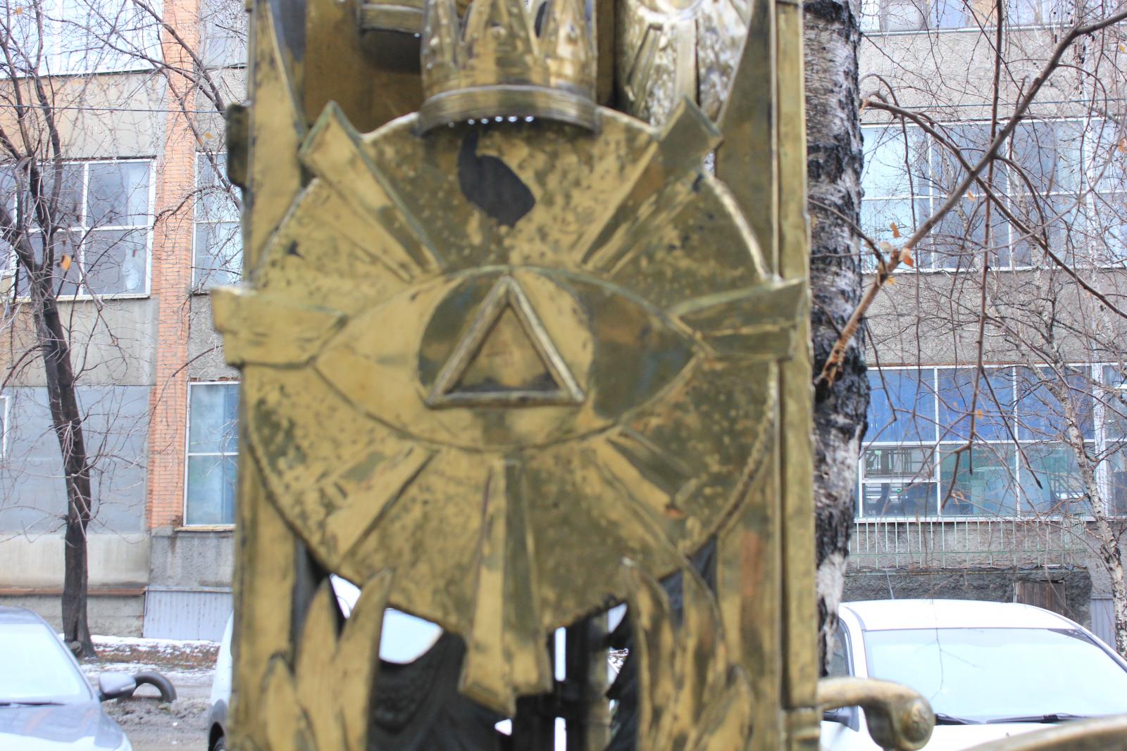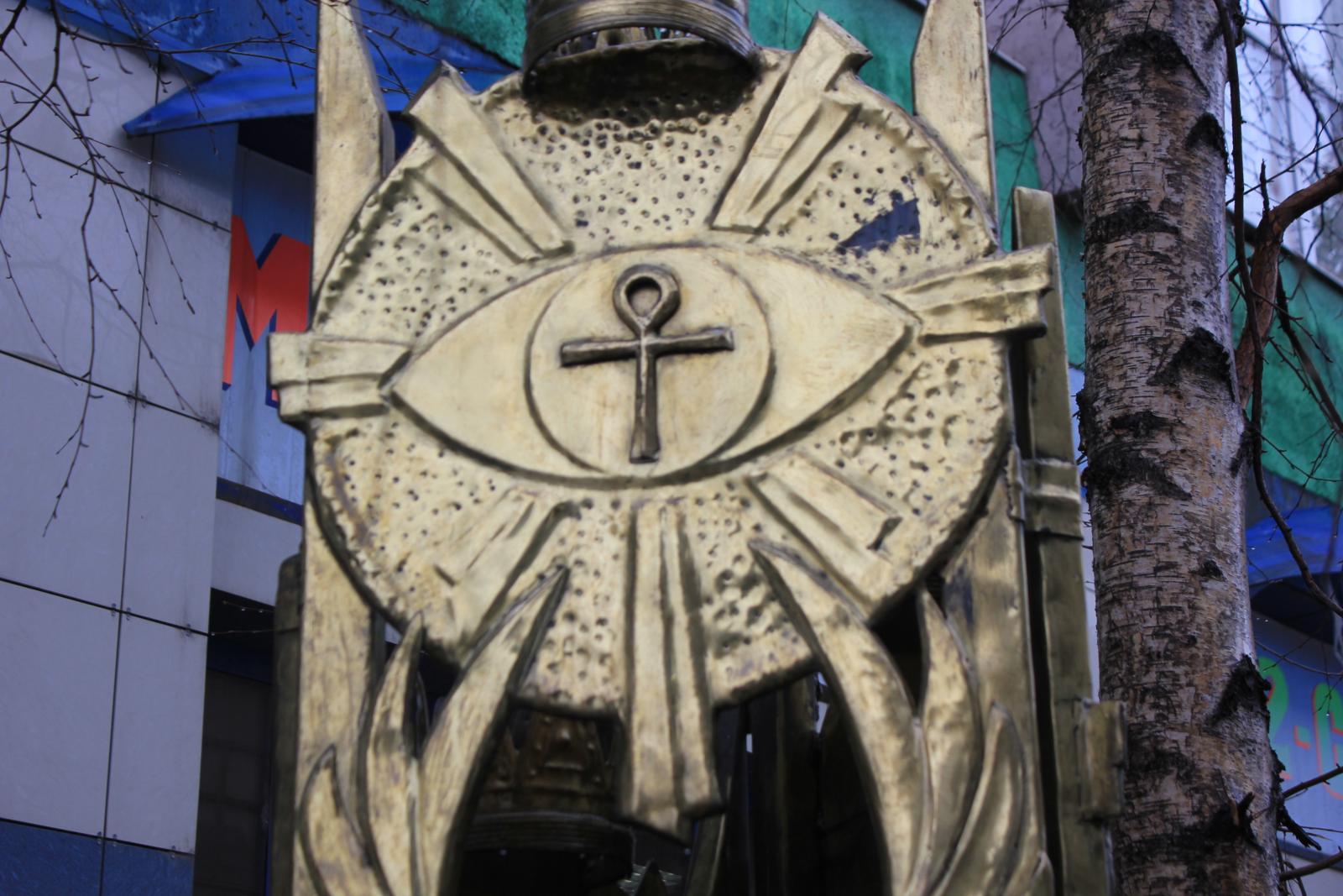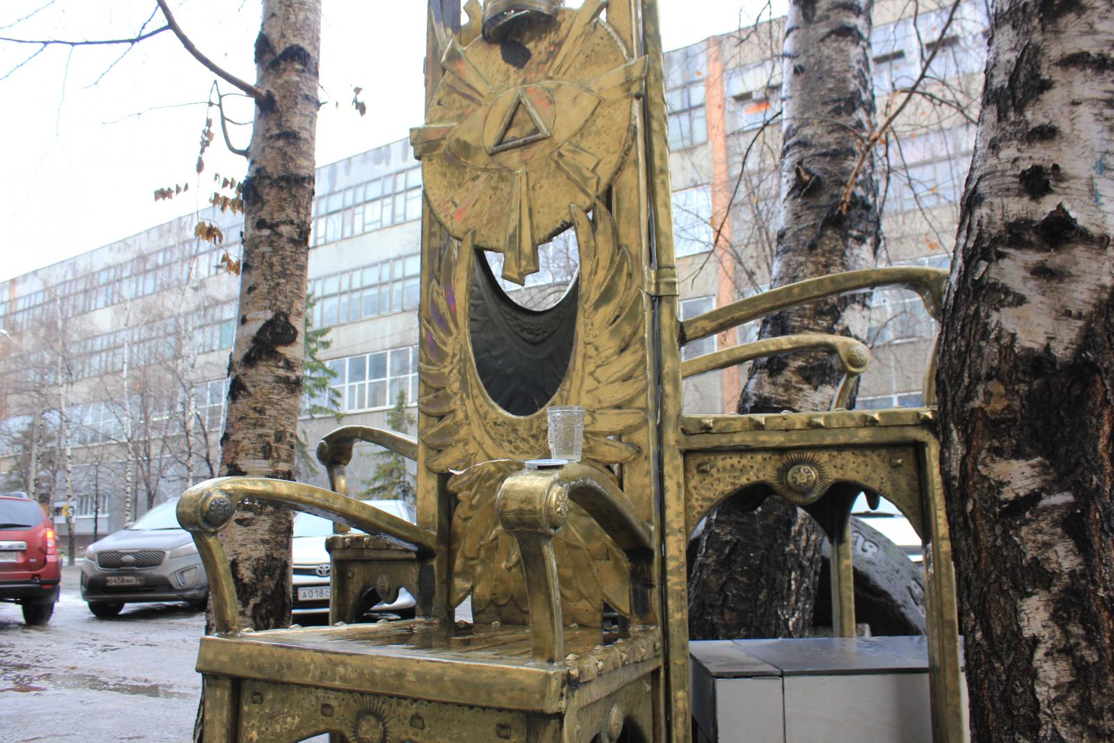 На третьем троне - знак, похожий на топографический символ хвойного леса из школьного учебника географии. Впрочем, в теории заговора и ему наверняка место найдется. А вот случайный прохожий, видимо, без бутылки не разберется. Кстати, следы попыток постигнуть истину нашлись на подлокотнике одного из сидений.