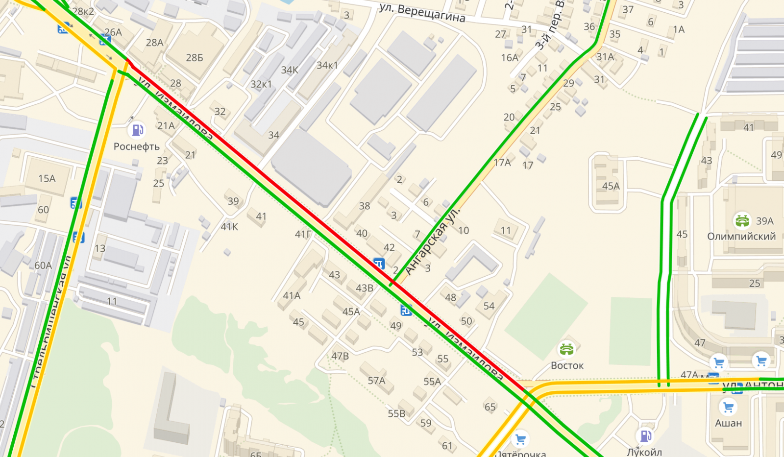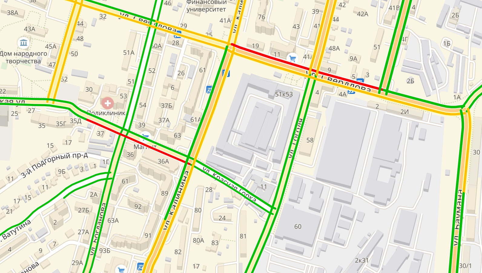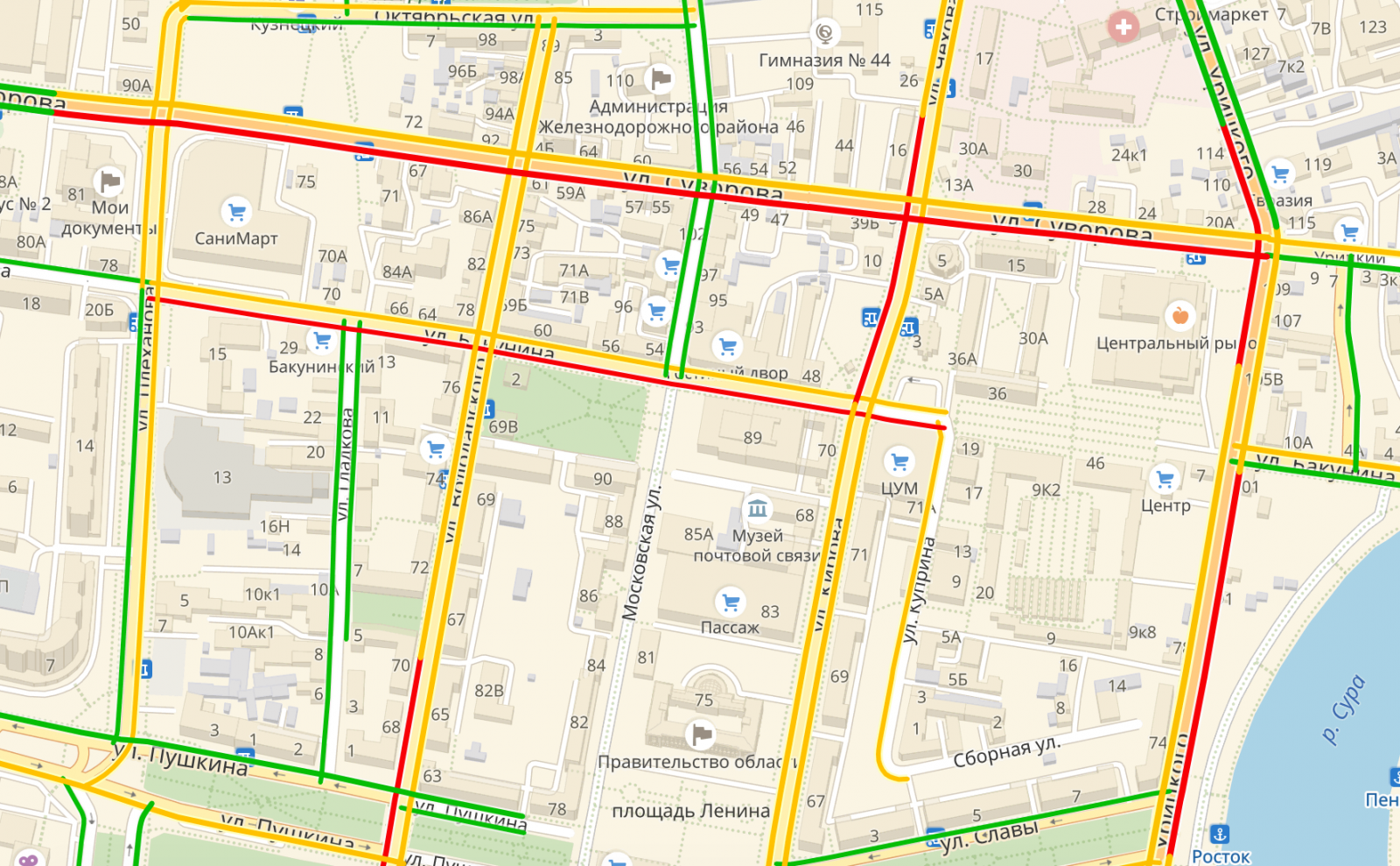 По данным сервиса Яндекс.Карты, снижена скорость автомобилей на улицах Суворова, Урицкого, Кирова, Чехова, Бакунина и Володарского.