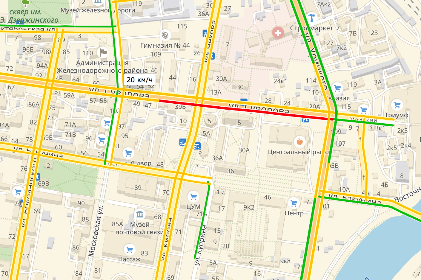 По данным сервиса Яндекс.Карты, снижена скорость автомобилей на улице Суворова.