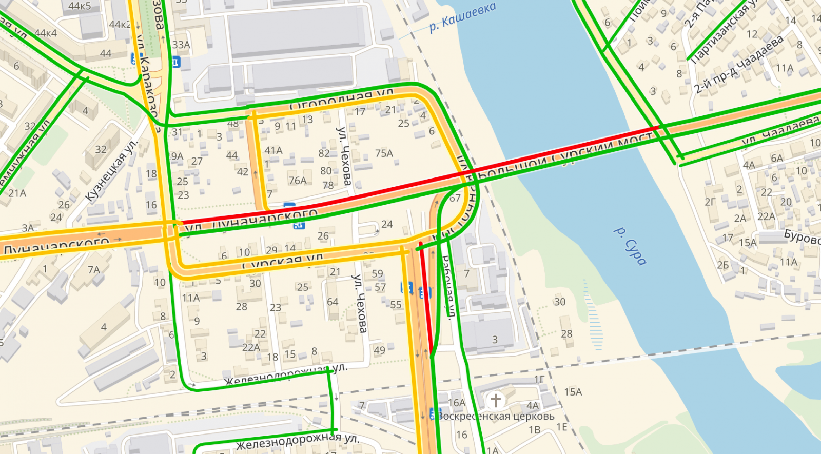 Ограничено движение на улице Луначарского и Большом Сурском мосту.