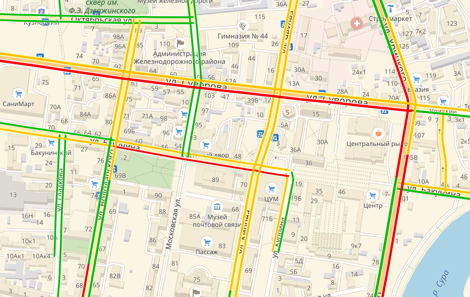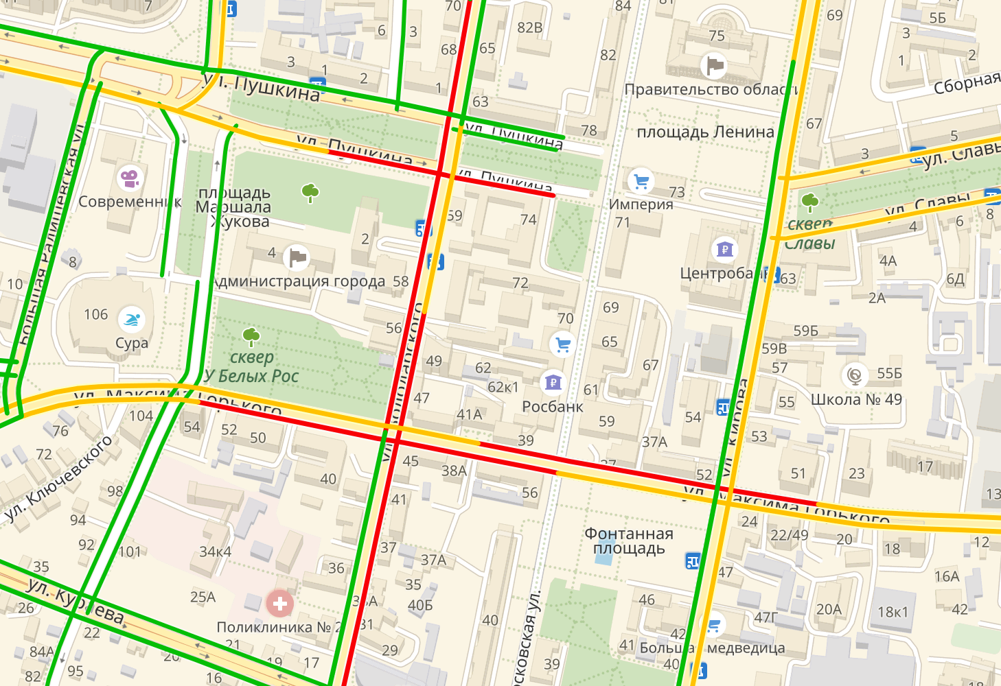 По данным сервиса Яндекс.Карты, снижена скорость автомобилей на улицах Суворова, Урицкого и Бакунина.
