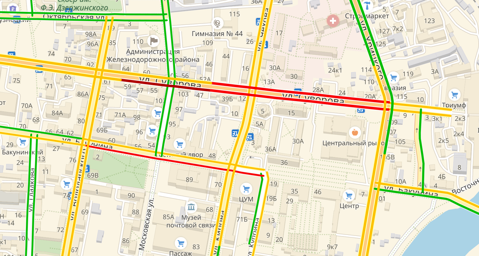 По данным сервиса Яндекс.Карты, снижена скорость автомобилей на улицах Суворова и Бакунина.