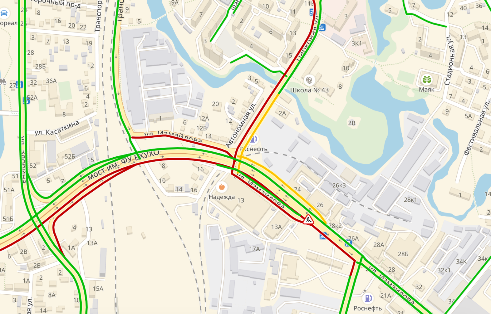 Пробки наблюдаются на Измайловском мосту и улице Парковая.