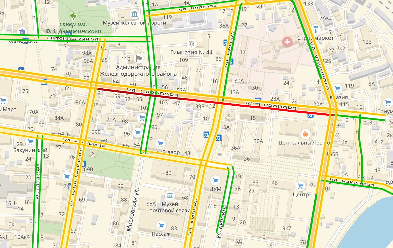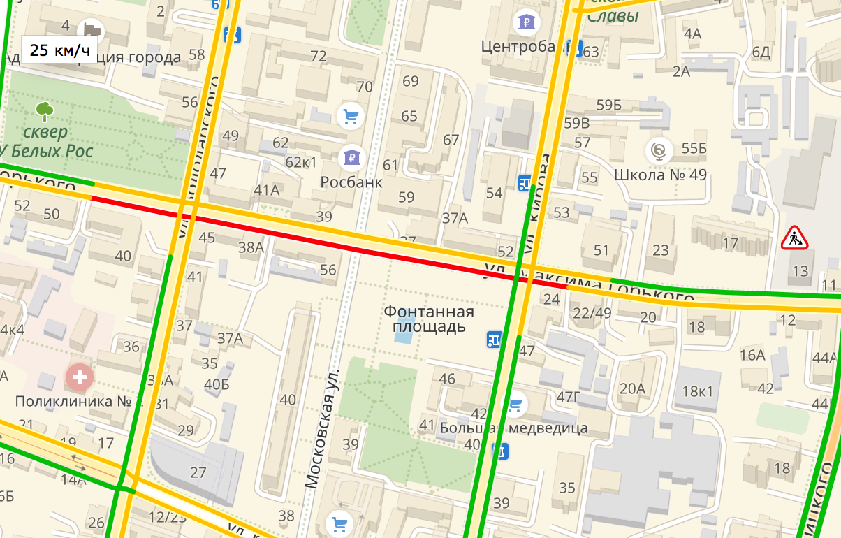 По данным сервиса Яндекс.Карты, снижена скорость автомобилей на улице Суворова.