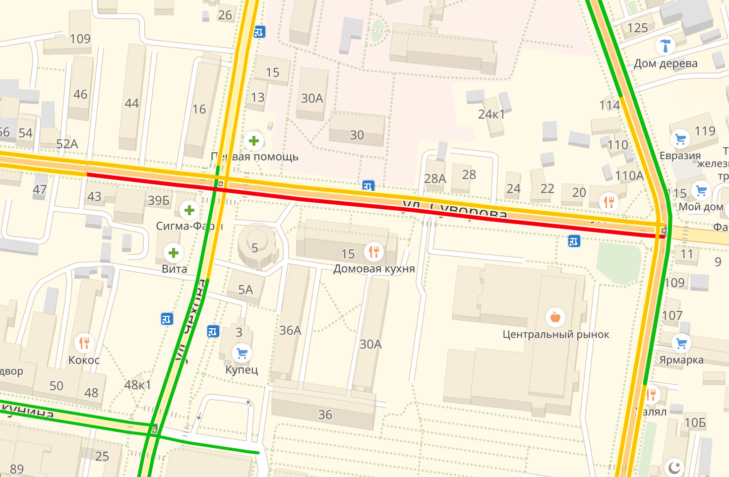 По данным сервиса Яндекс.Карты, снижена скорость автомобилей на улице Суворова.