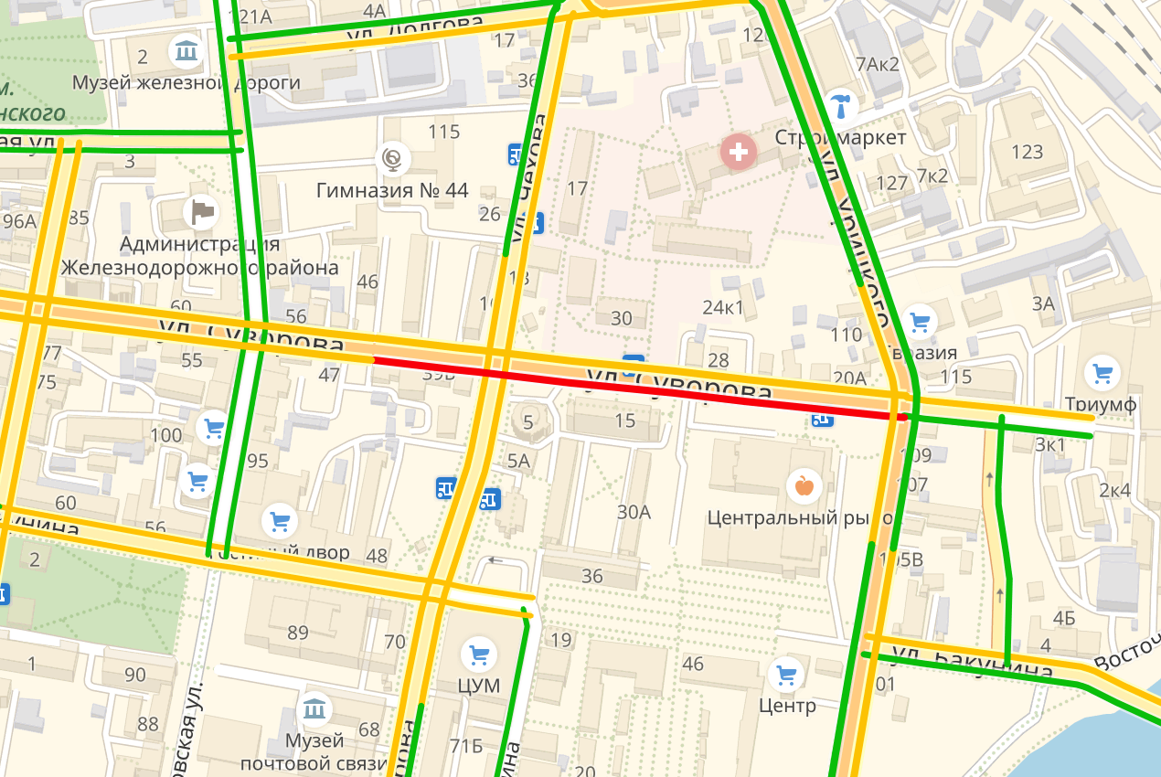 По данным сервиса Яндекс.Карты, снижена скорость автомобилей на улице Суворова.