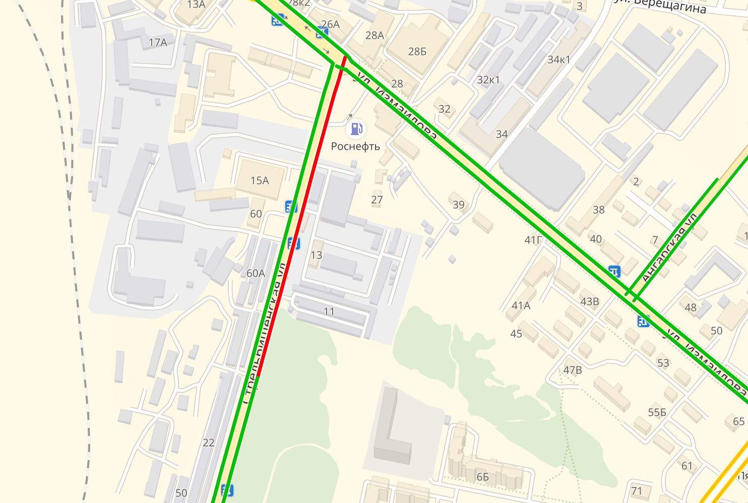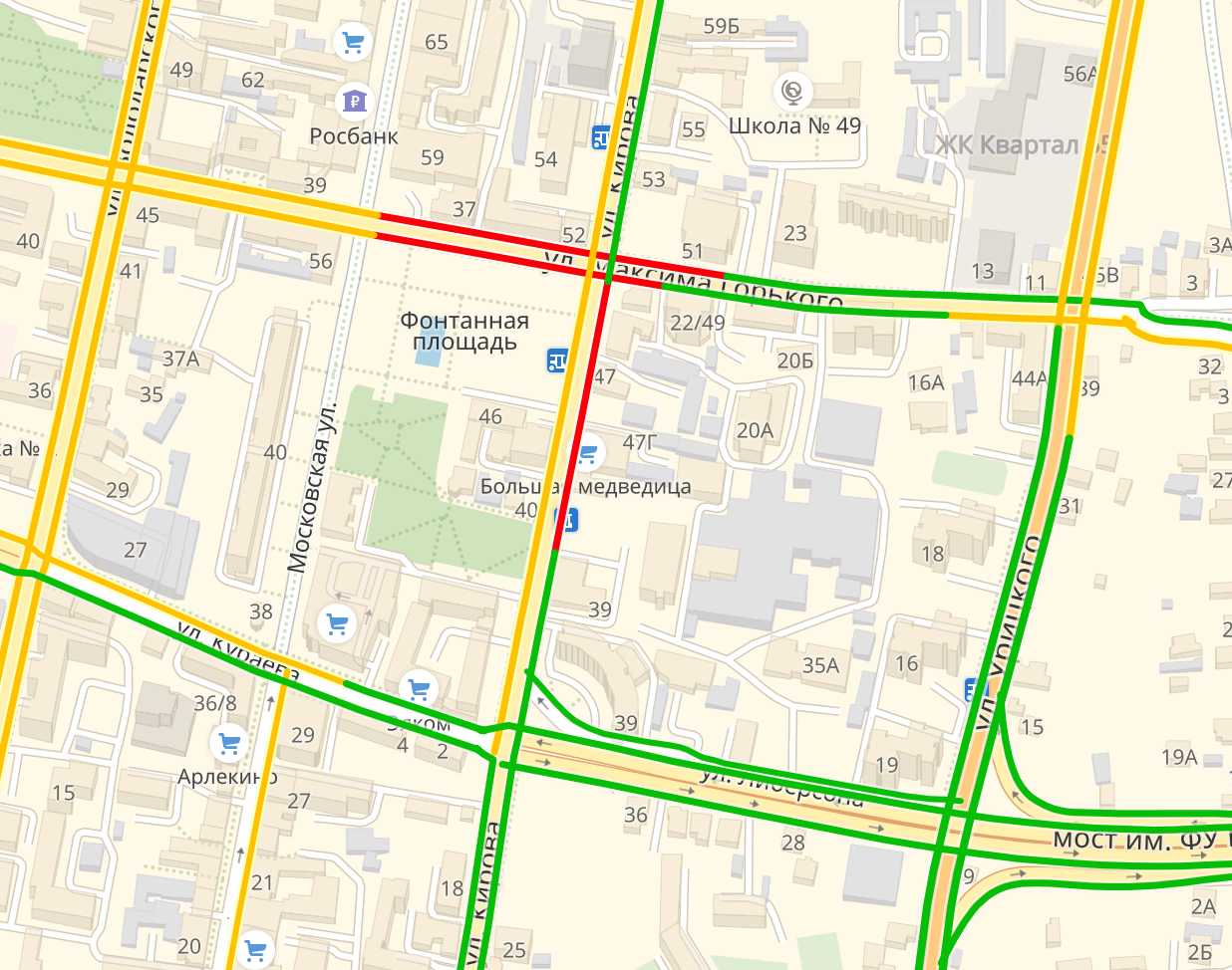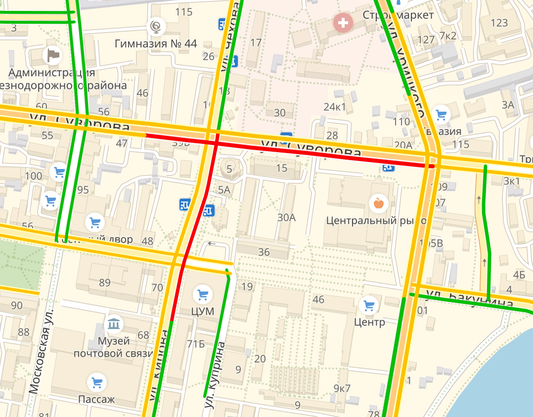По данным сервиса Яндекс.Карты, снижена скорость автомобилей на улицах Суворова и Кирова.