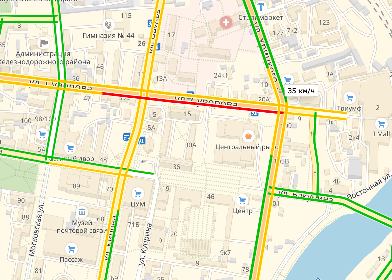 По данным сервиса Яндекс.Карты, снижена скорость автомобилей на улице Суворова.