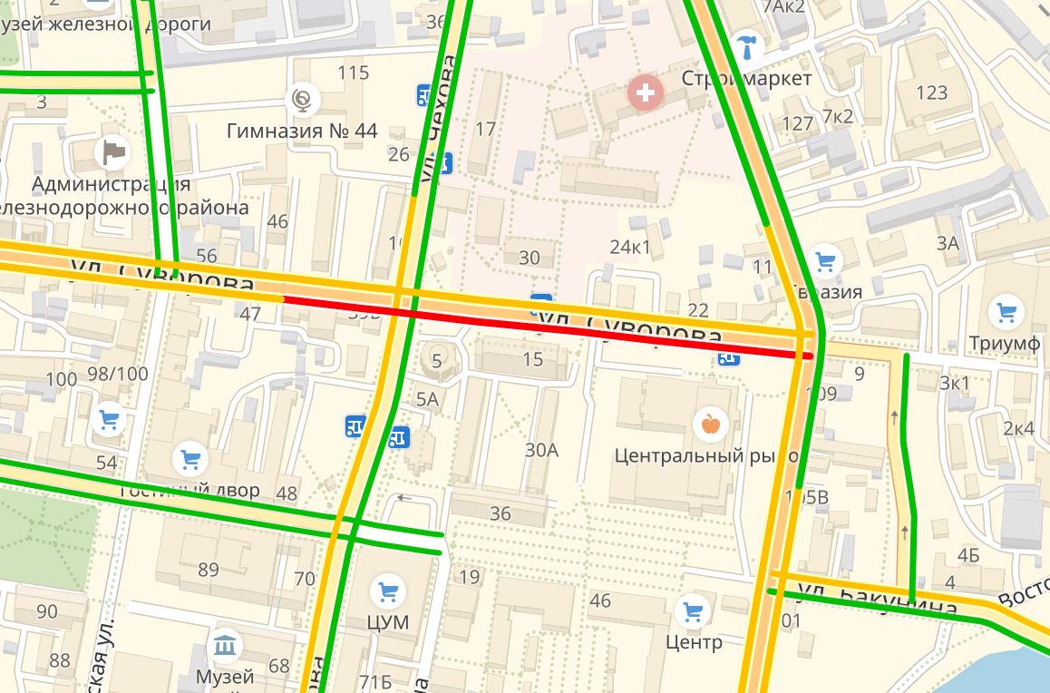 По данным сервиса Яндекс.Карты, снижена скорость автомобилей на улице Суворова.