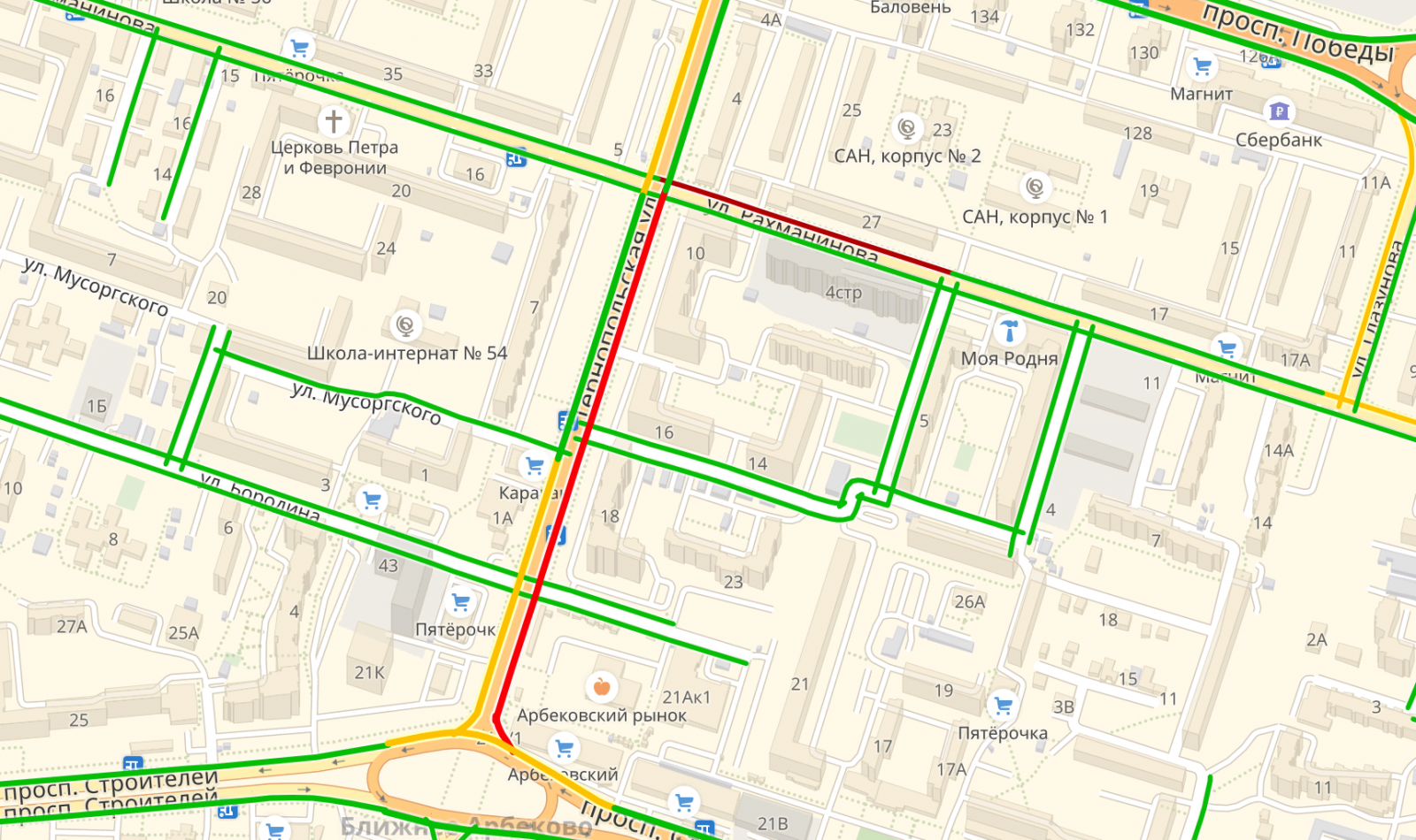 По данным сервиса Яндекс.Карты, снижена скорость автомобилей на улицах Суворова и Володарского.