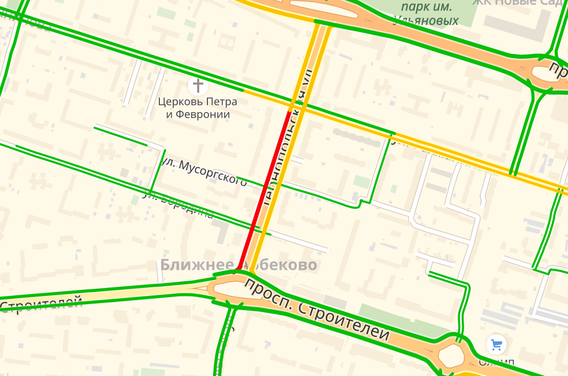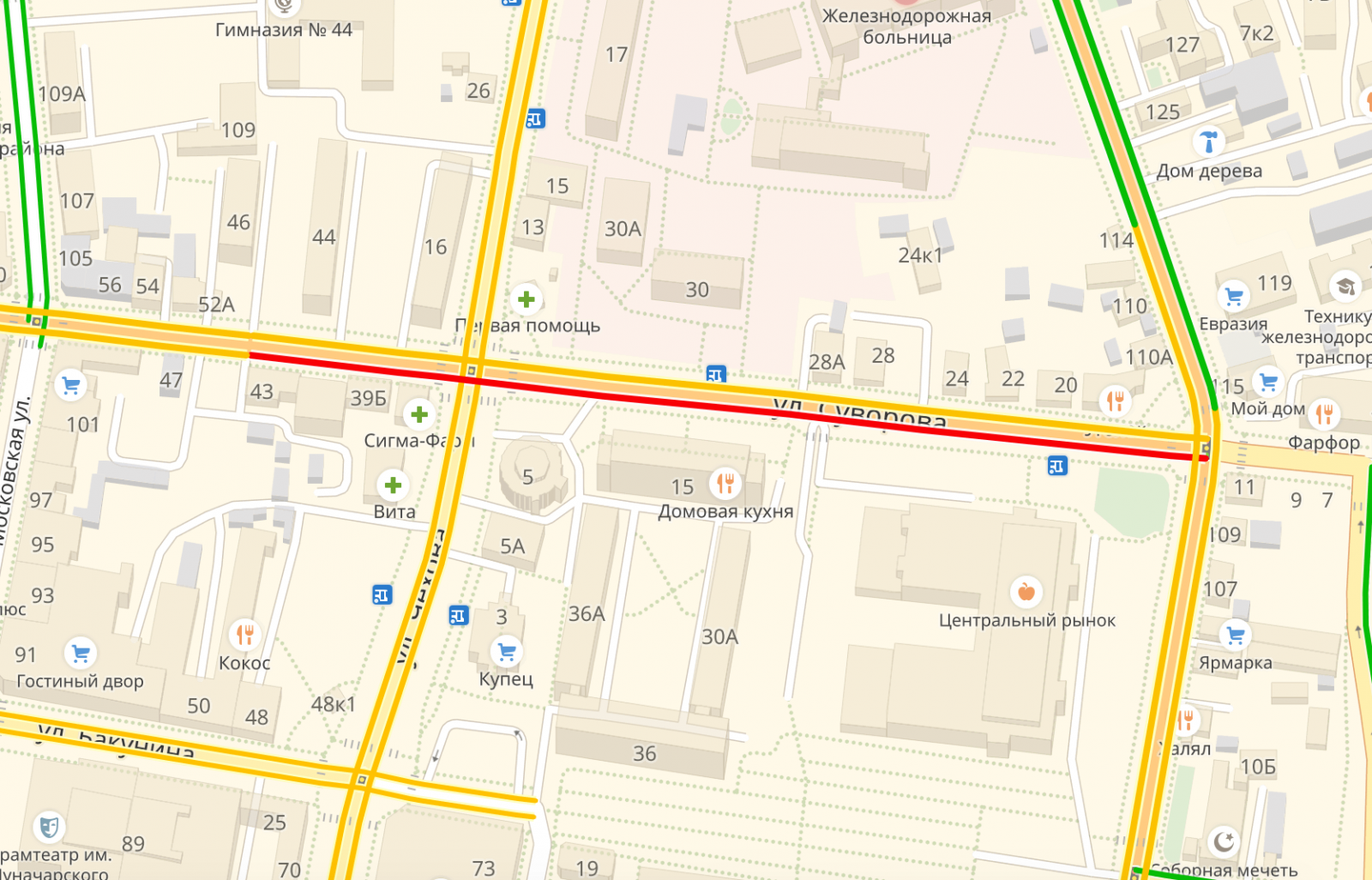 По данным сервиса Яндекс.Карты, снижена скорость автомобилей на улице Суворова.