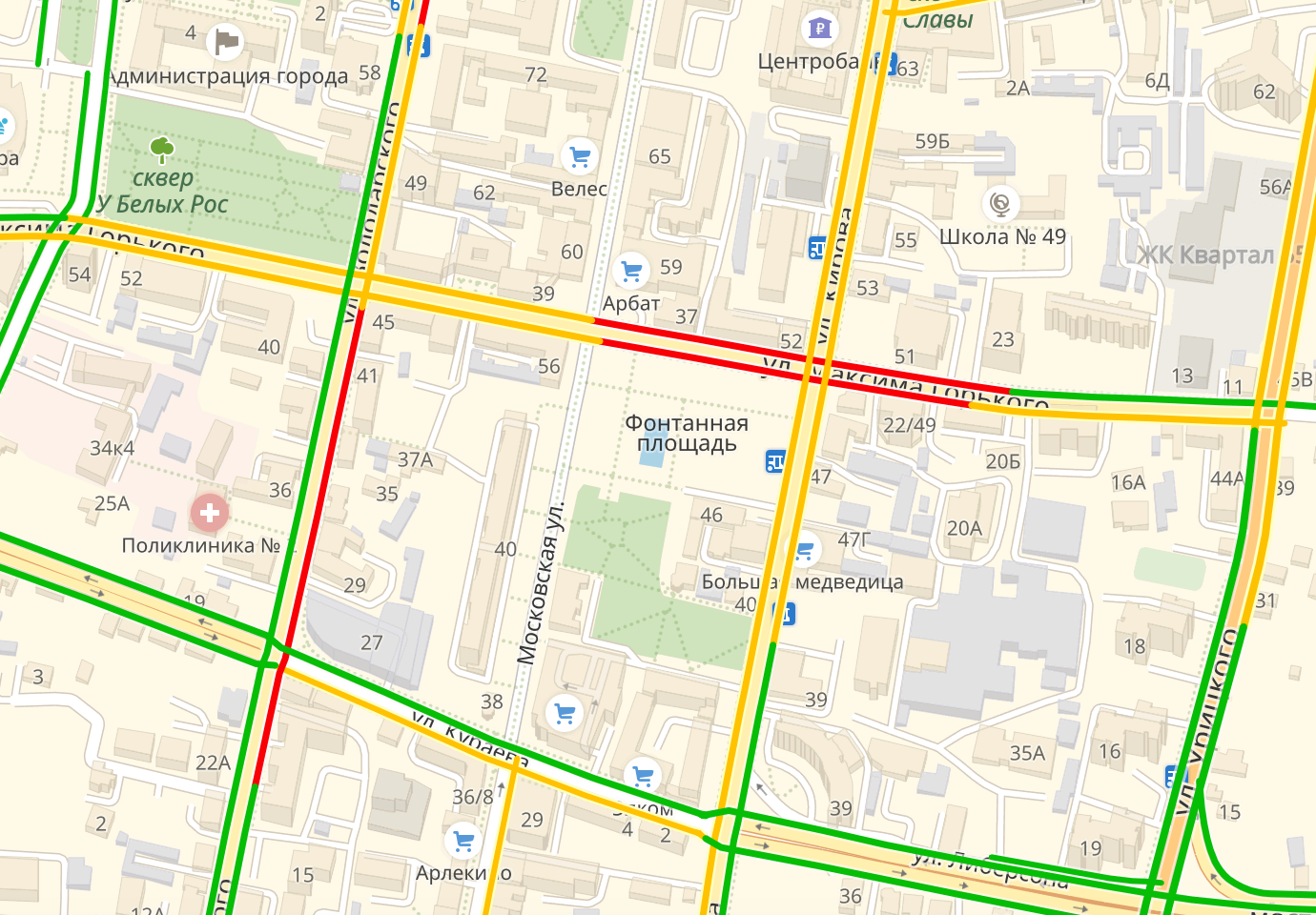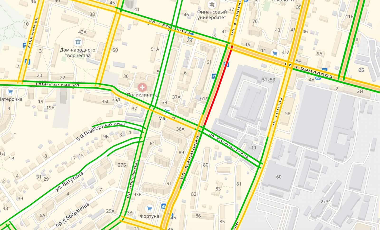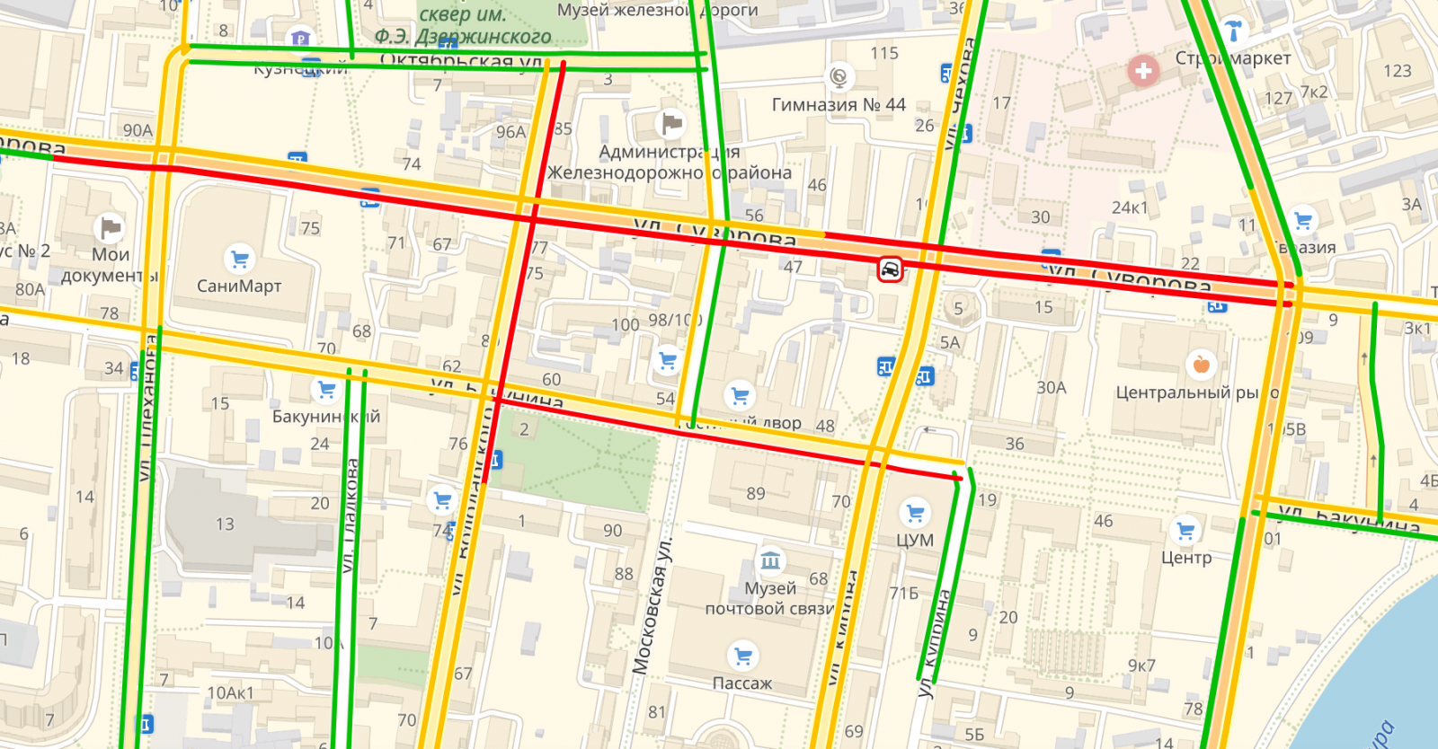 По данным сервиса Яндекс.Карты, снижена скорость автомобилей на улицах Суворова, Володарского и Бакунина.