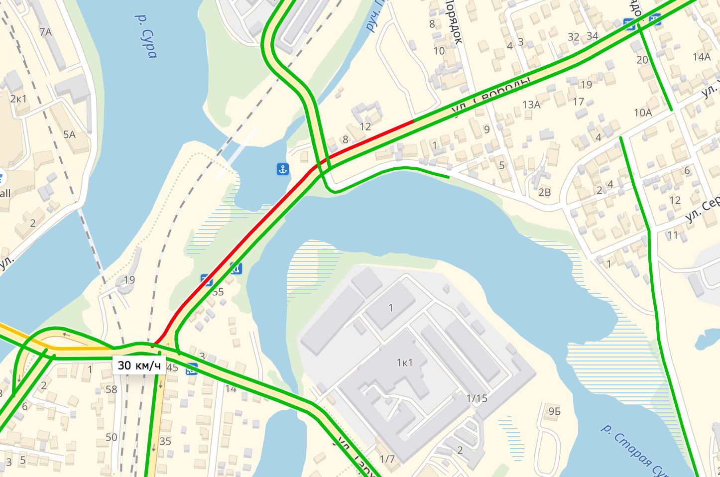 По данным сервиса Яндекс.Карты, снижена скорость автомобилей на улицах Суворова и Урицкого.