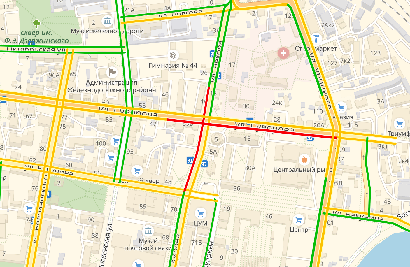 По данным сервиса Яндекс.Карты, снижена скорость автомобилей на улицах Суворова, Чехова и Кирова.