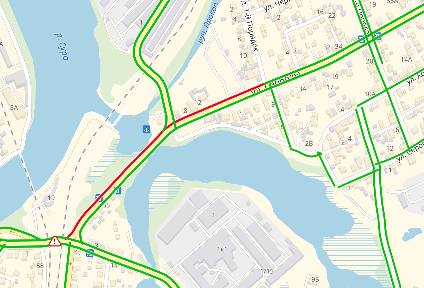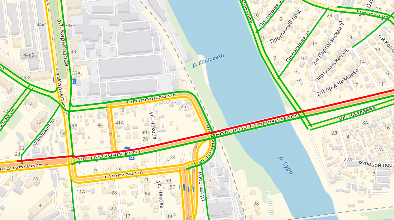 Пробки наблюдаются на Большом Сурском мосту и улице Луначарского.