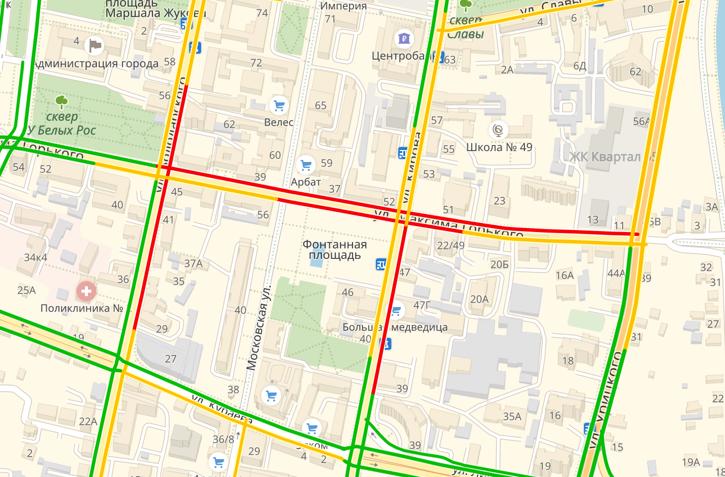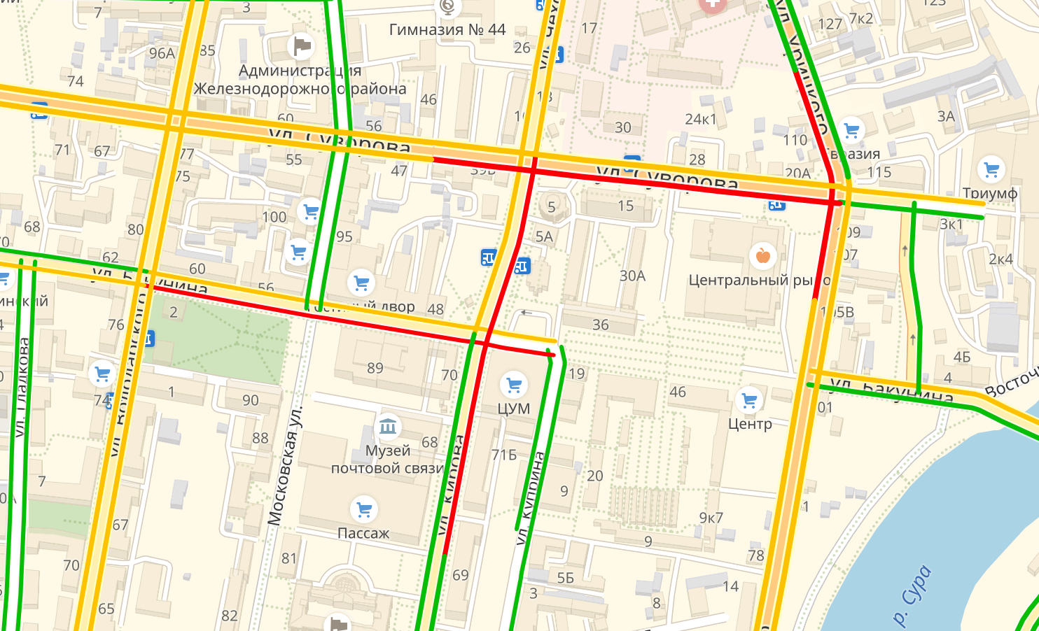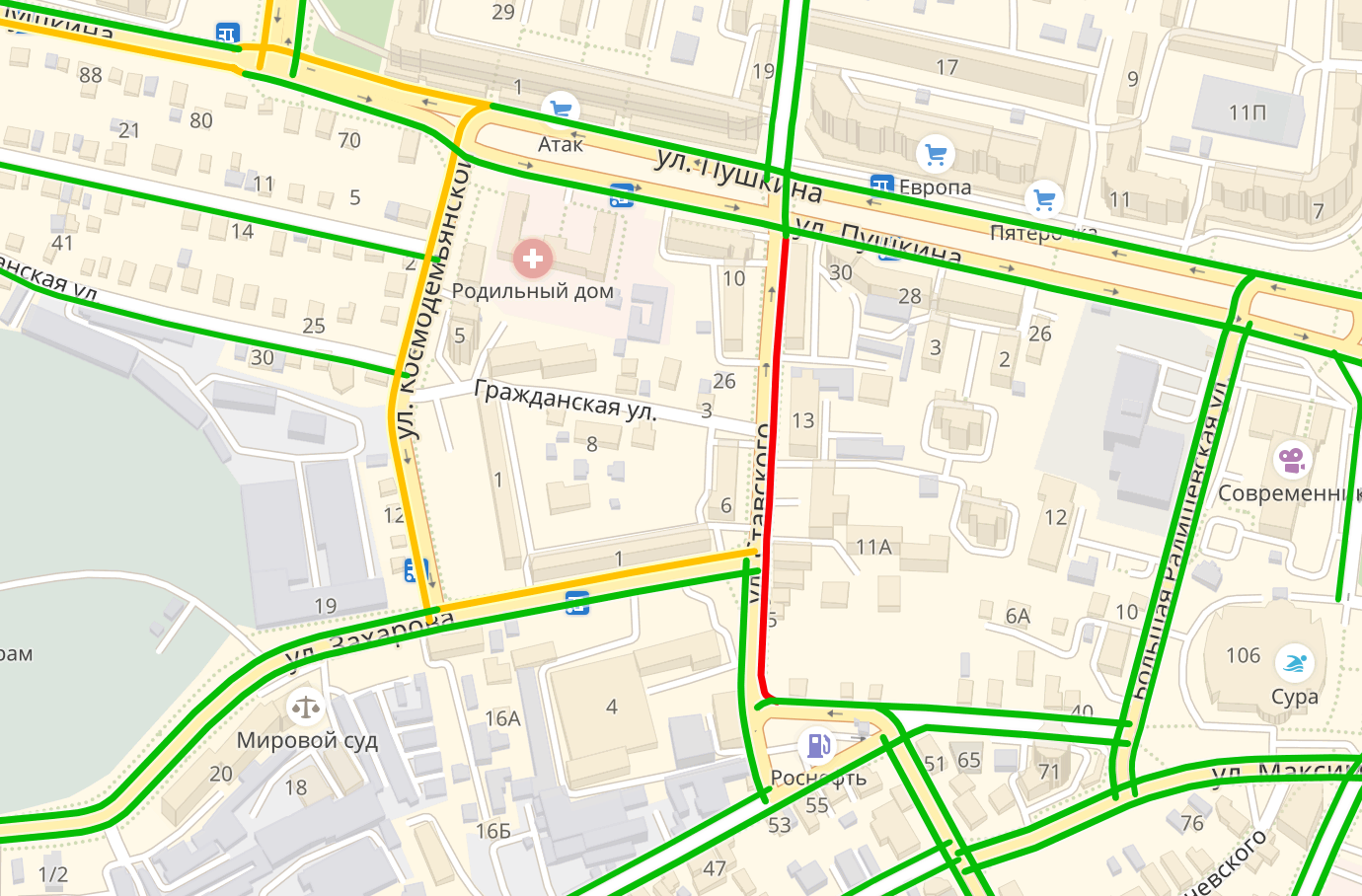 По данным сервиса Яндекс.Карты, снижена скорость автомобилей на улицах Урицкого, Суворова, Кирова и Бакунина.