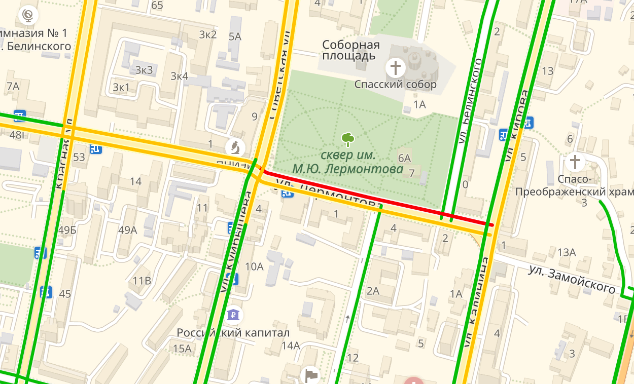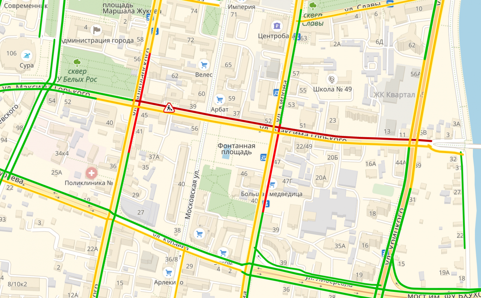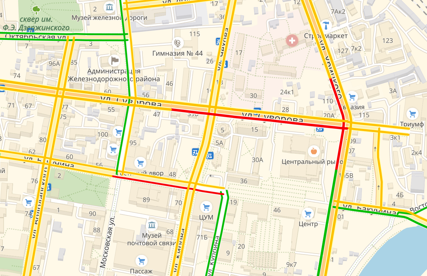 По данным сервиса Яндекс.Карты, снижена скорость автомобилей на улицах Суворова, Урицкого и Бакунина.