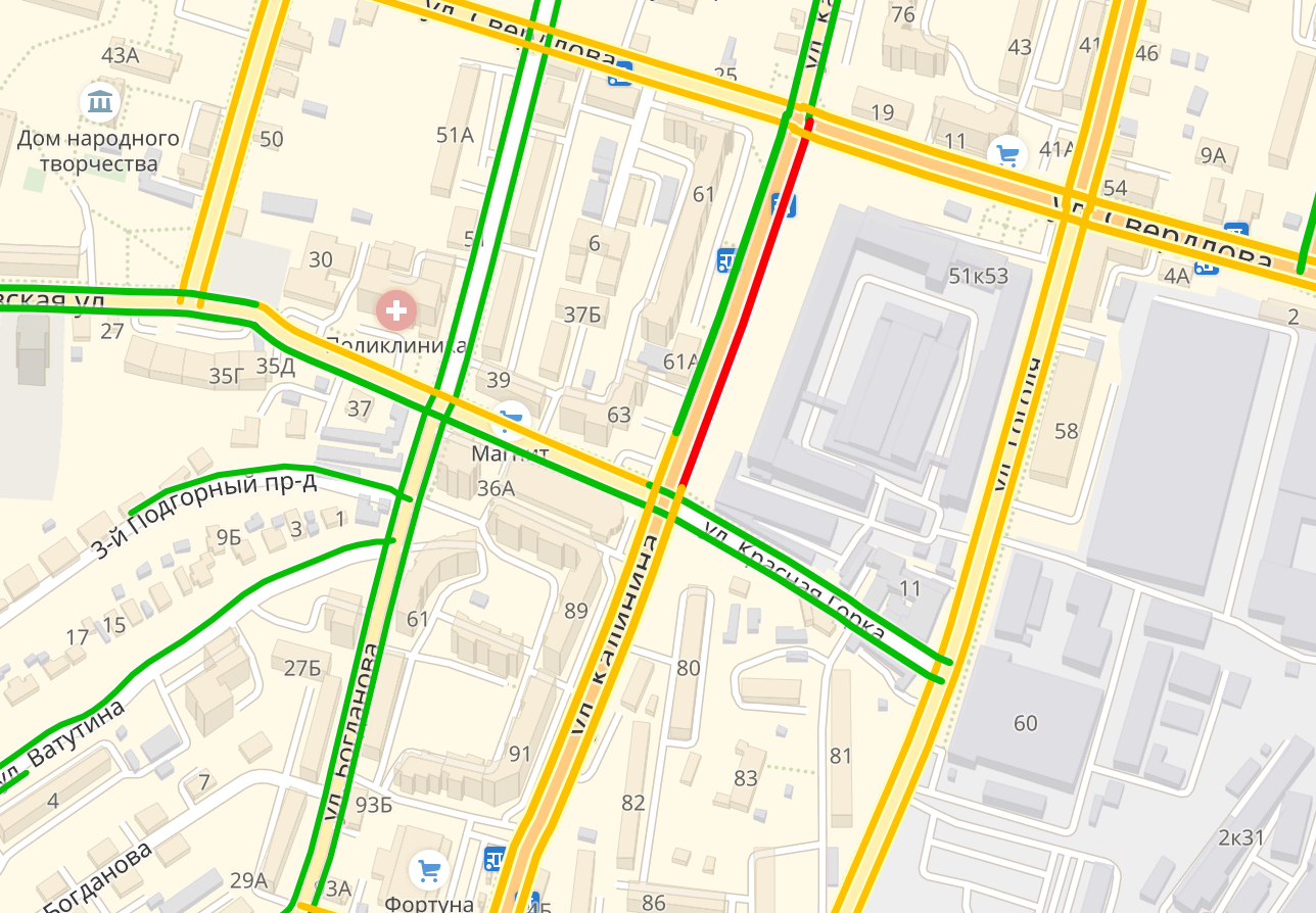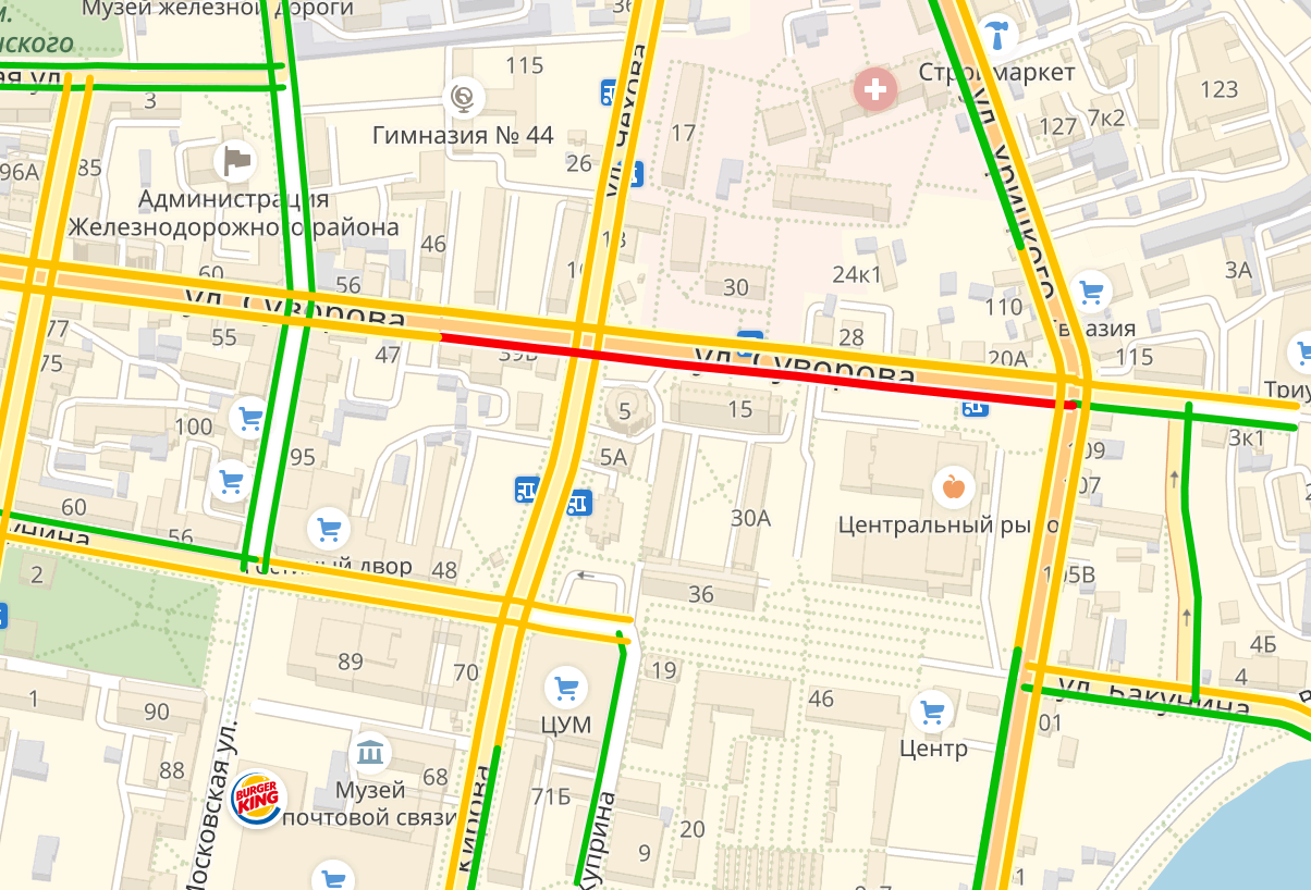 По данным сервиса Яндекс.Карты, снижена скорость автомобилей на улице Суворова.