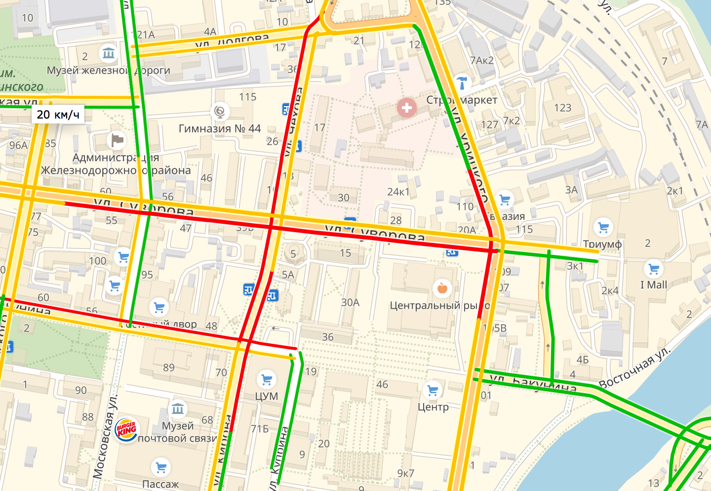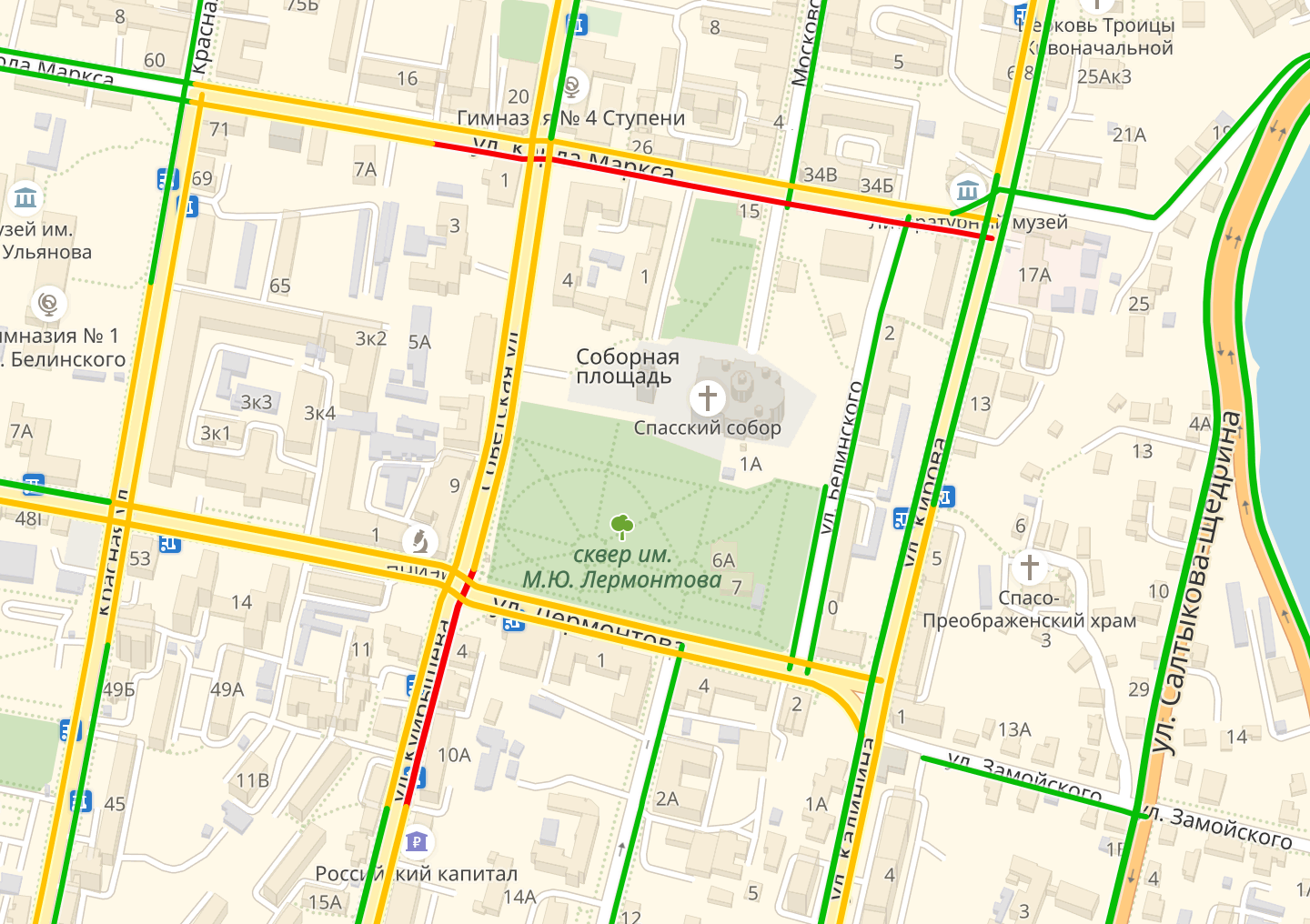 По данным сервиса Яндекс.Карты, снижена скорость автоомбилей на улицах Урицкого, Суворова, Бакунина, Чехова и Кирова.