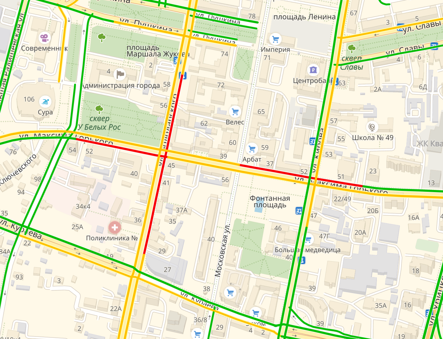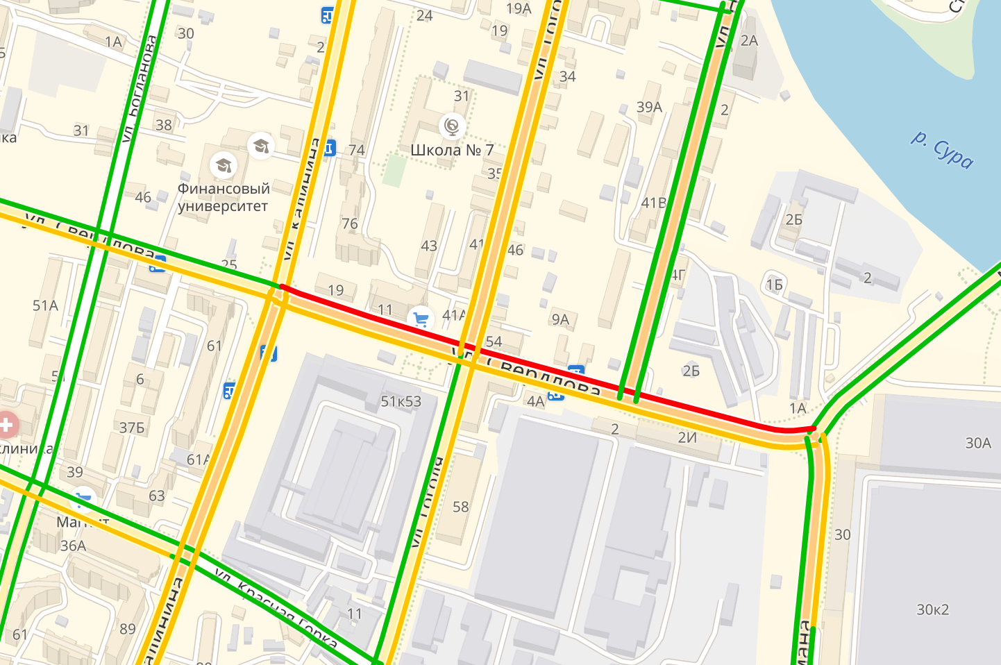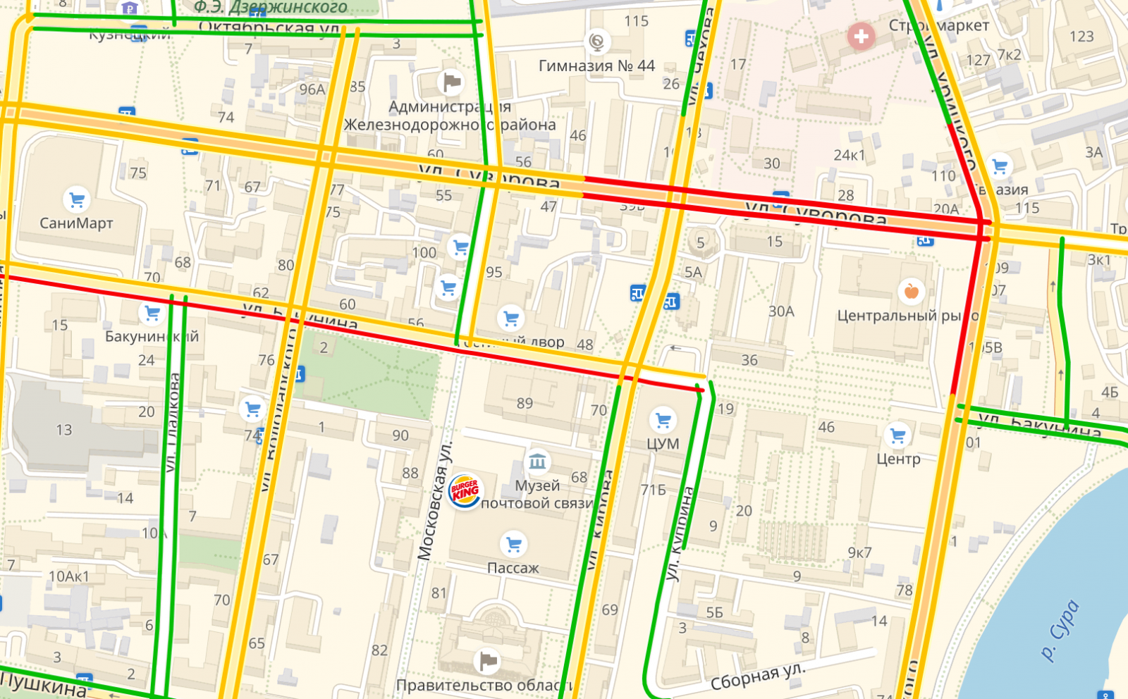 По данным сервиса Яндекс.Карты, снижена скорость автоомбилей на улицах Суворова и Бакунина.