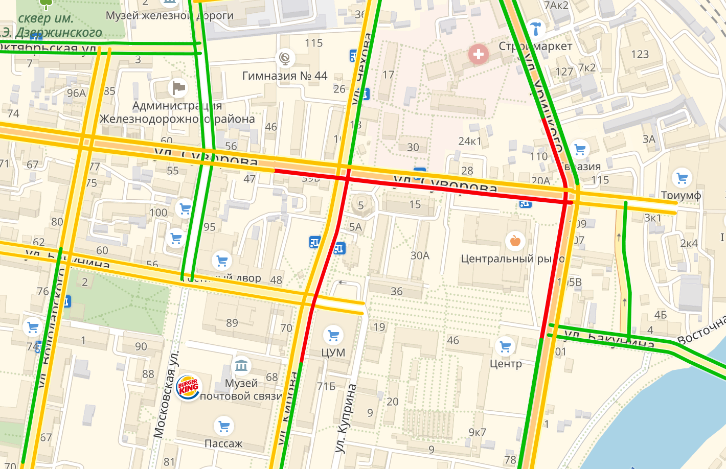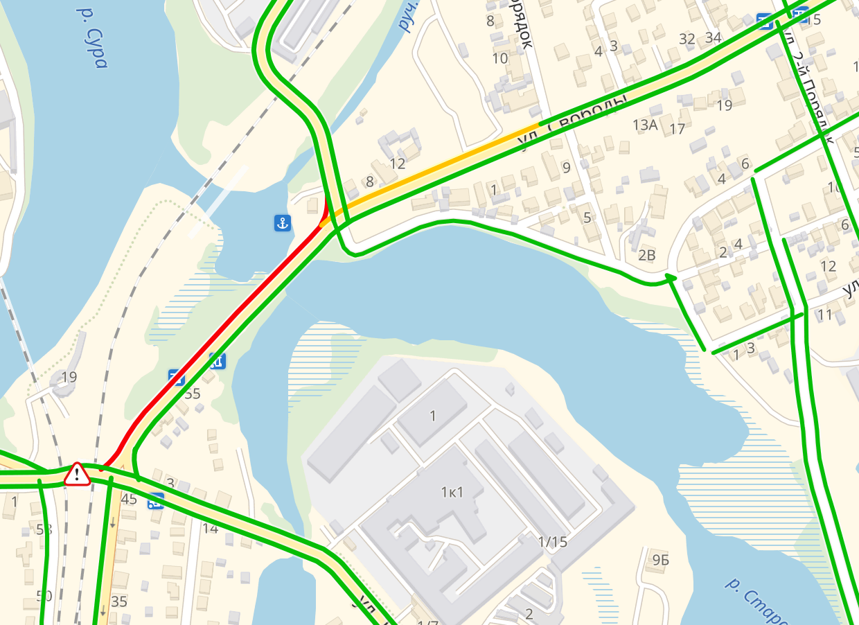 По данным сервиса Яндекс.Карты, снижена скорость автомобилей на улицах Суворова, Урицкого и Кирова.